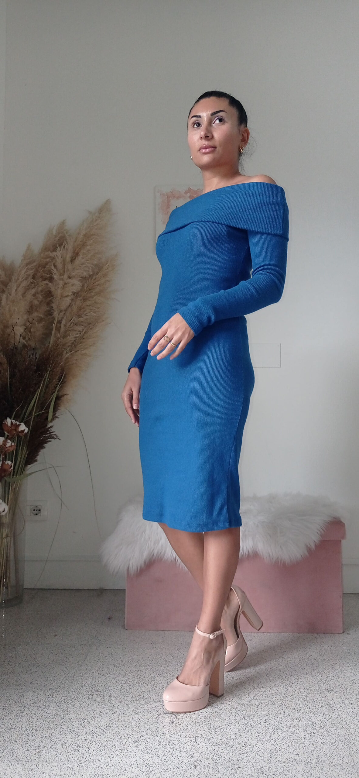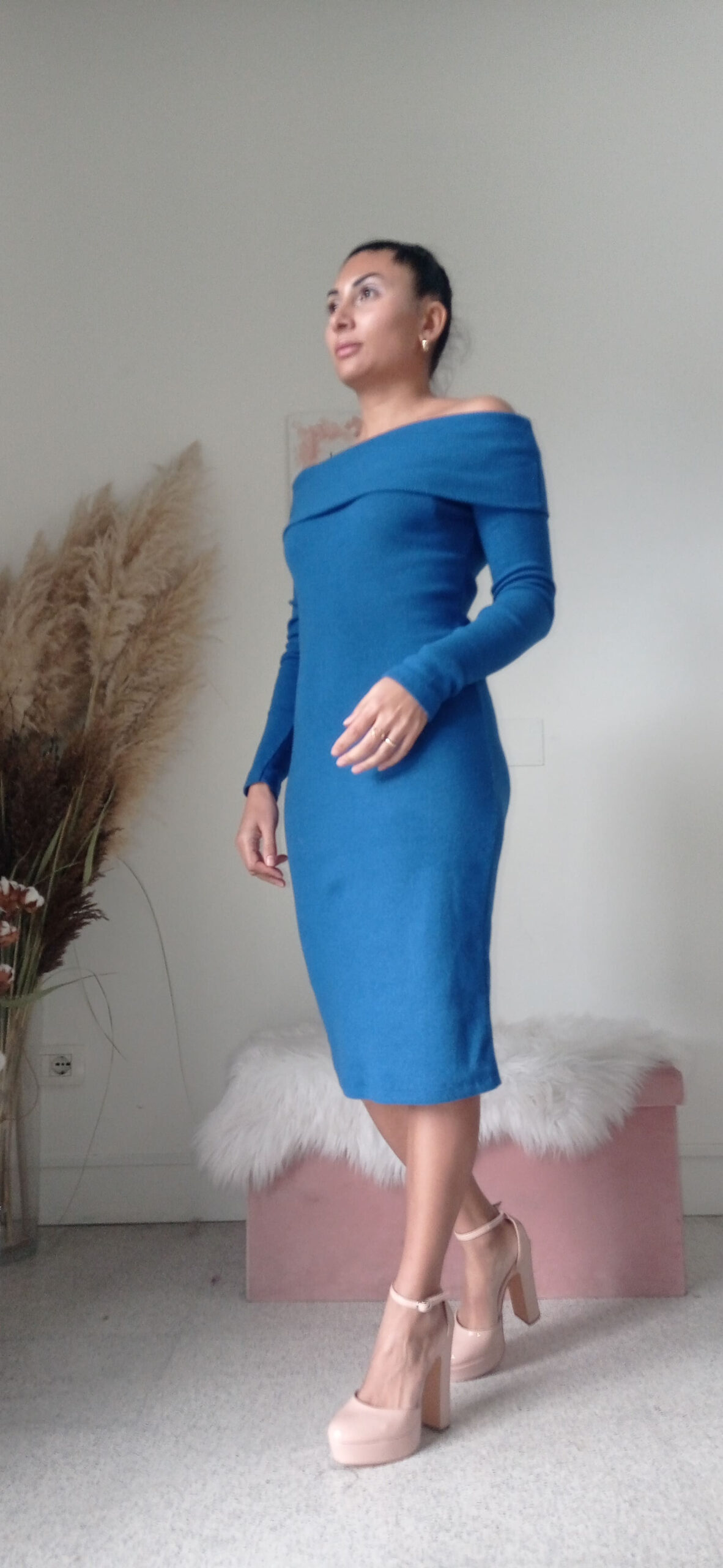 Abito Midi in Caldo Cotone con Scollo alla Carmen – Eleganza e Comfort per l’Inverno