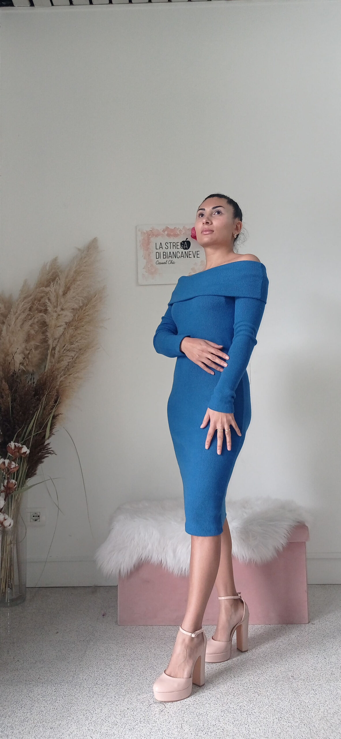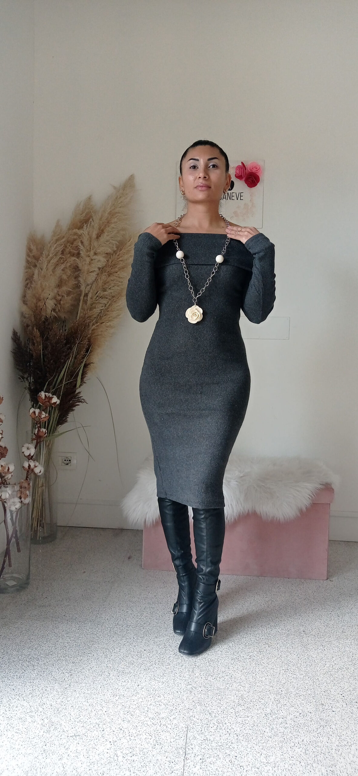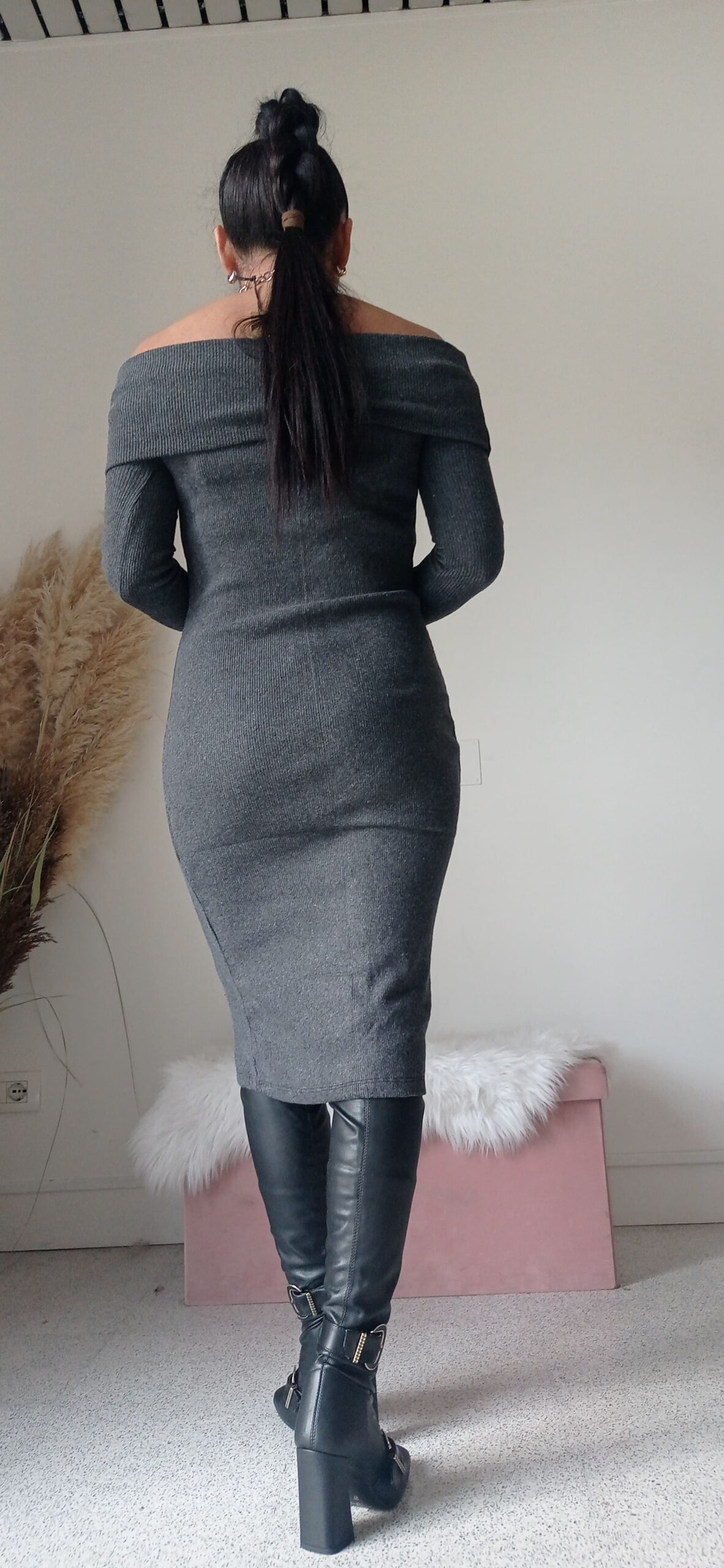 Abito Midi in Caldo Cotone con Scollo alla Carmen – Eleganza e Comfort per l’Inverno”