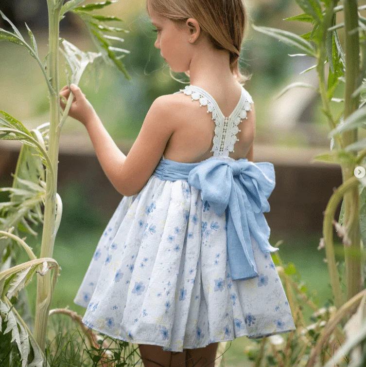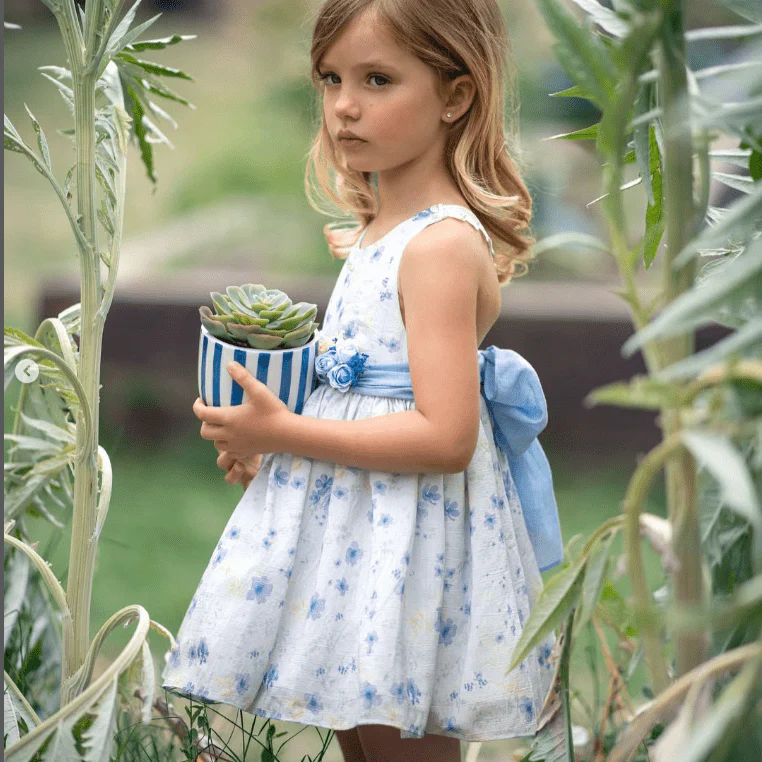 Un abito da bimba che incanta con la sua eleganza bucolica: il tessuto leggero è impreziosito da una delicata fantasia floreale, che richiama la bellezza dei giardini in fiore. La cintura in vita, con un raffinato fioccone arricchito da un dettaglio floreale, aggiunge un tocco di romanticismo e raffinatezza. Perfetto per una cerimonia o un’occasione speciale, questo abito regala un look da piccola principessa, tra grazia e dolcezza.