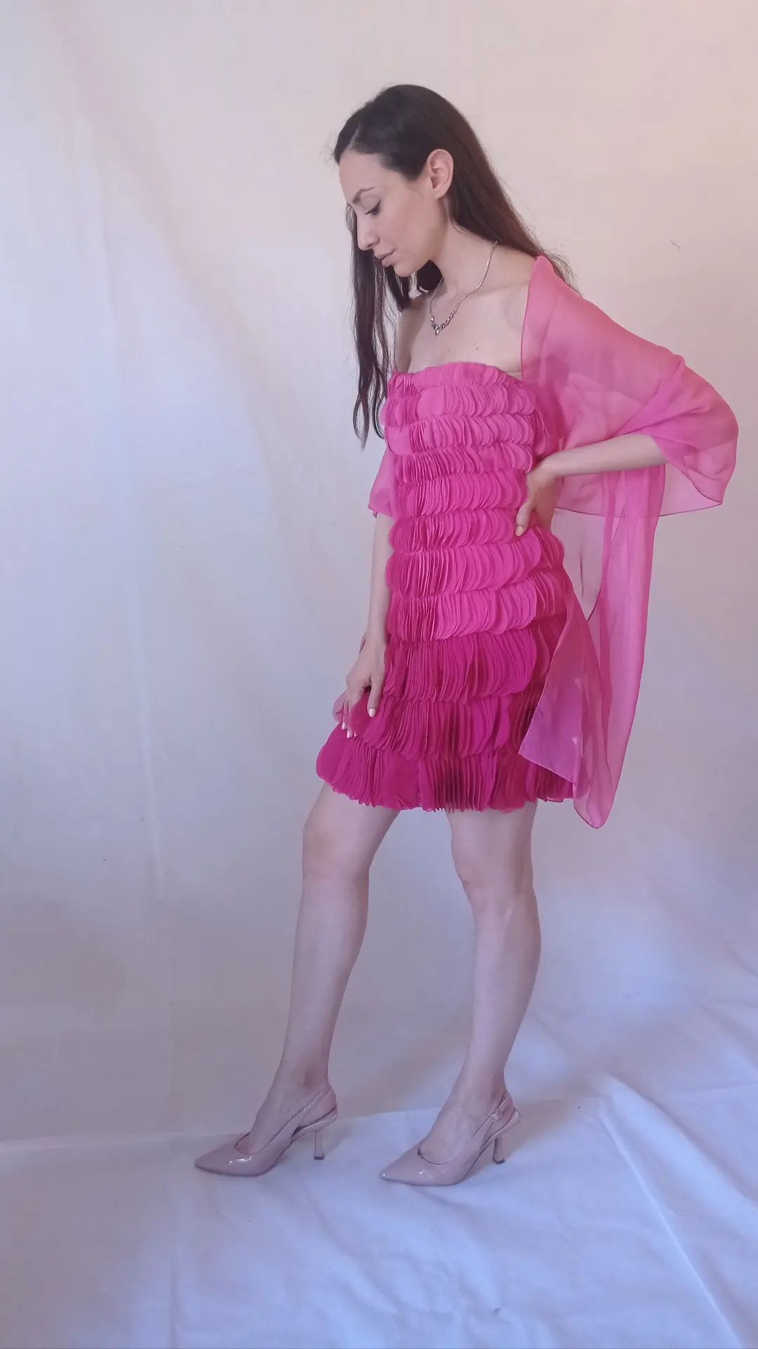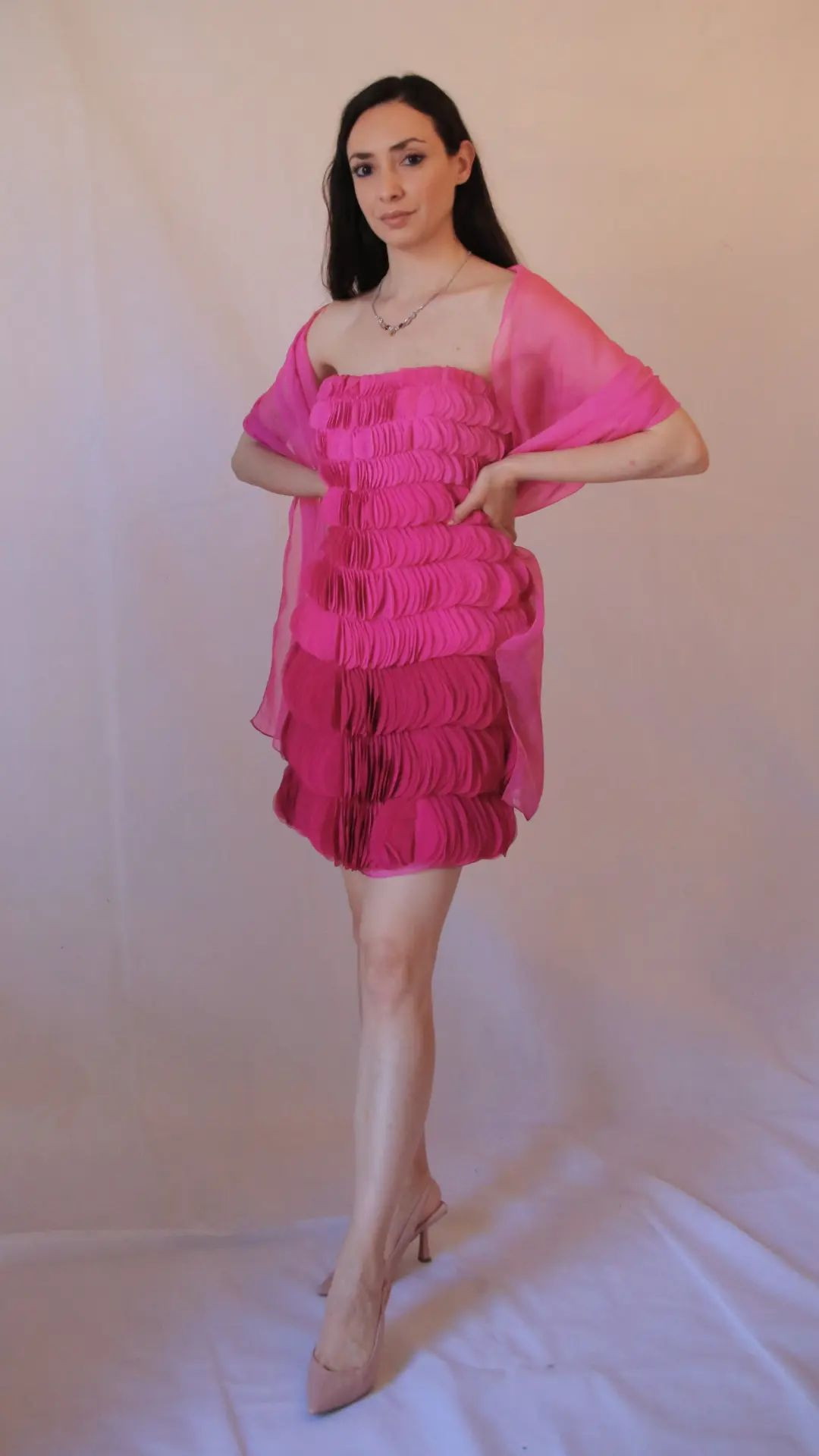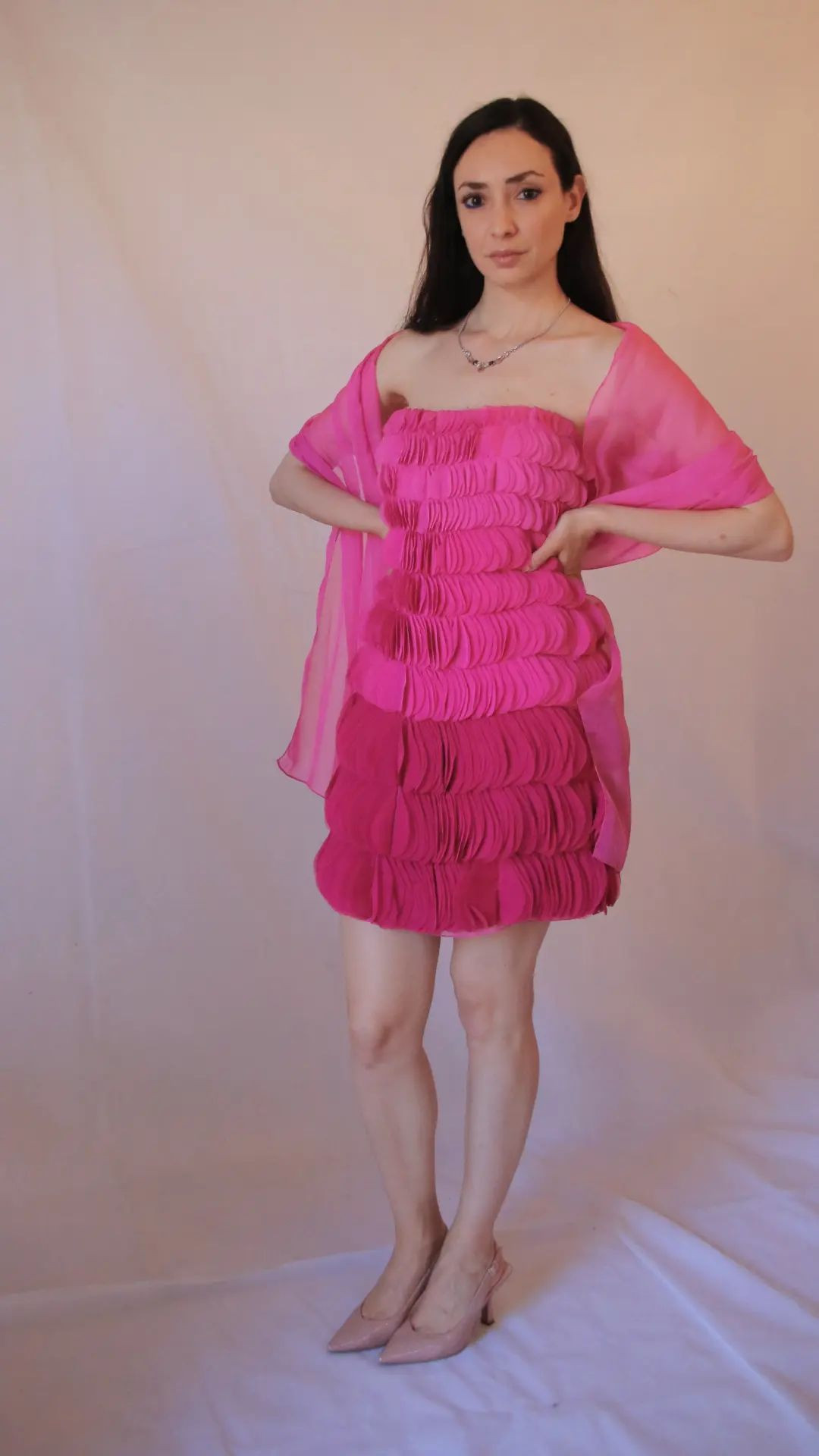 Abito rosa acceso cerimonia con stola Art. Piuma