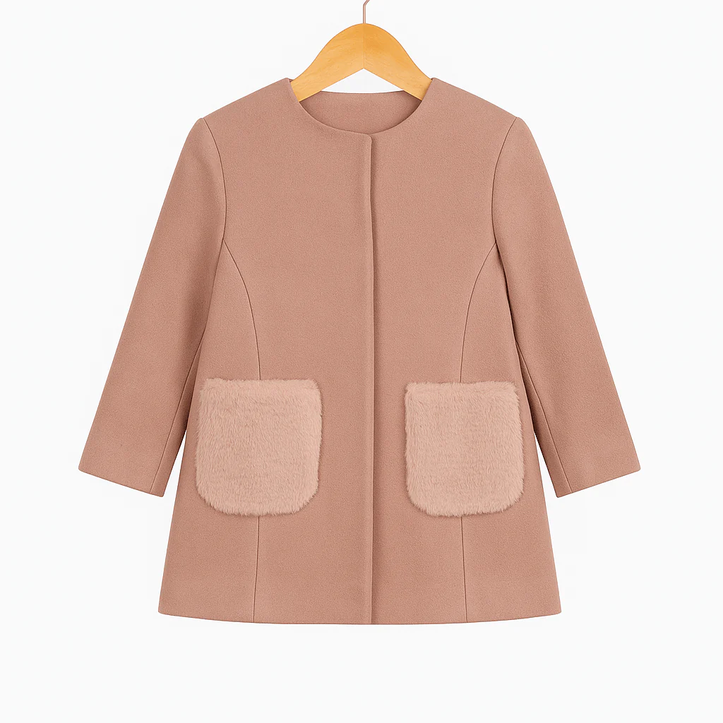 Cappotto rosa antico dalla linea pulita ed elegante, impreziosito da due tasche frontali in morbida ecopelliccia che donano texture e carattere al design. Presenta una silhouette dritta con taglio essenziale e chiusura nascosta, per un effetto raffinato e minimalista. Un modello versatile e moderno, perfetto per completare con stile ogni look invernale.