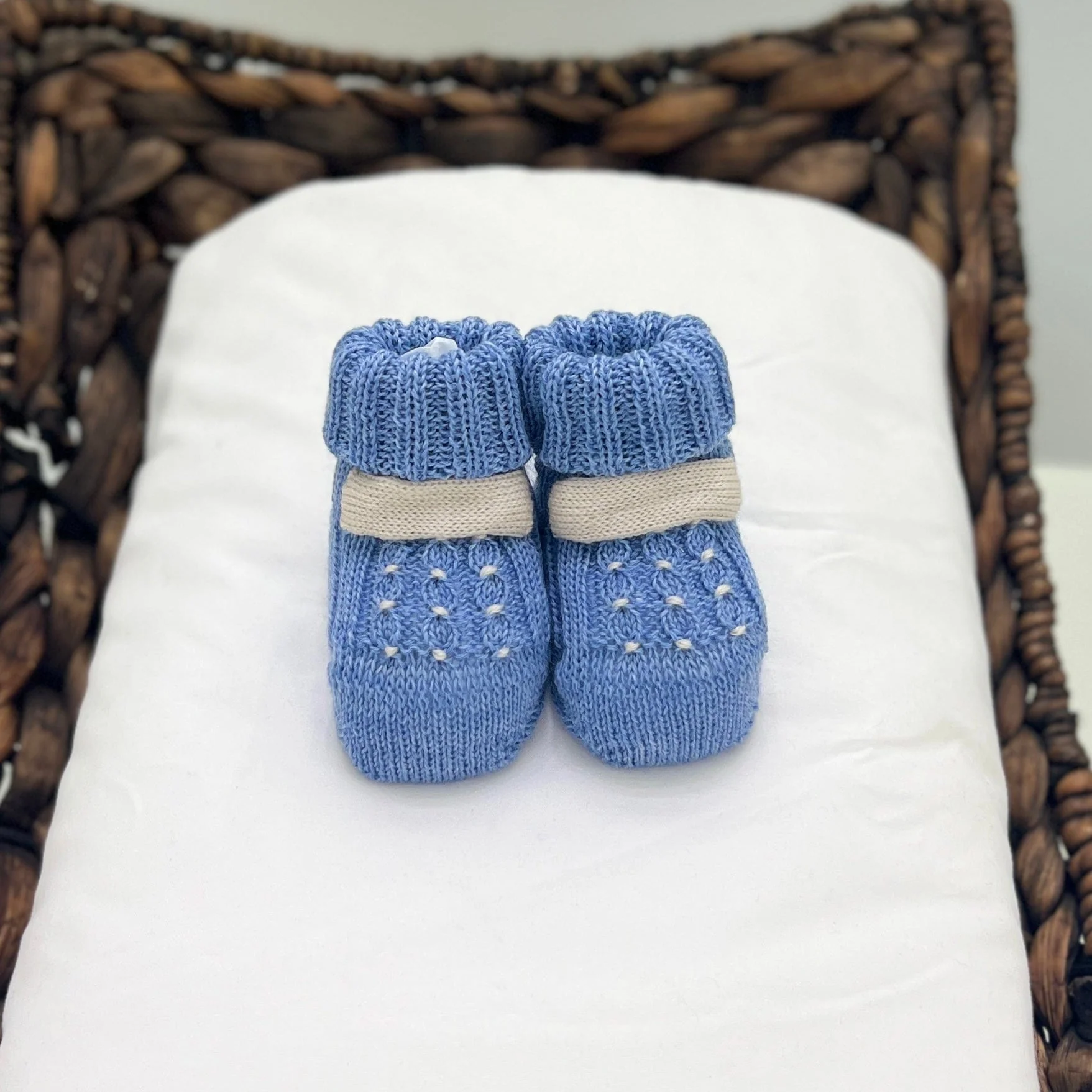 Le scarpette hanno chiusura con elastico per assicurare una vestibilità sicura e comoda, mantenendo i piedini del neonato al caldo e protetti con stile.