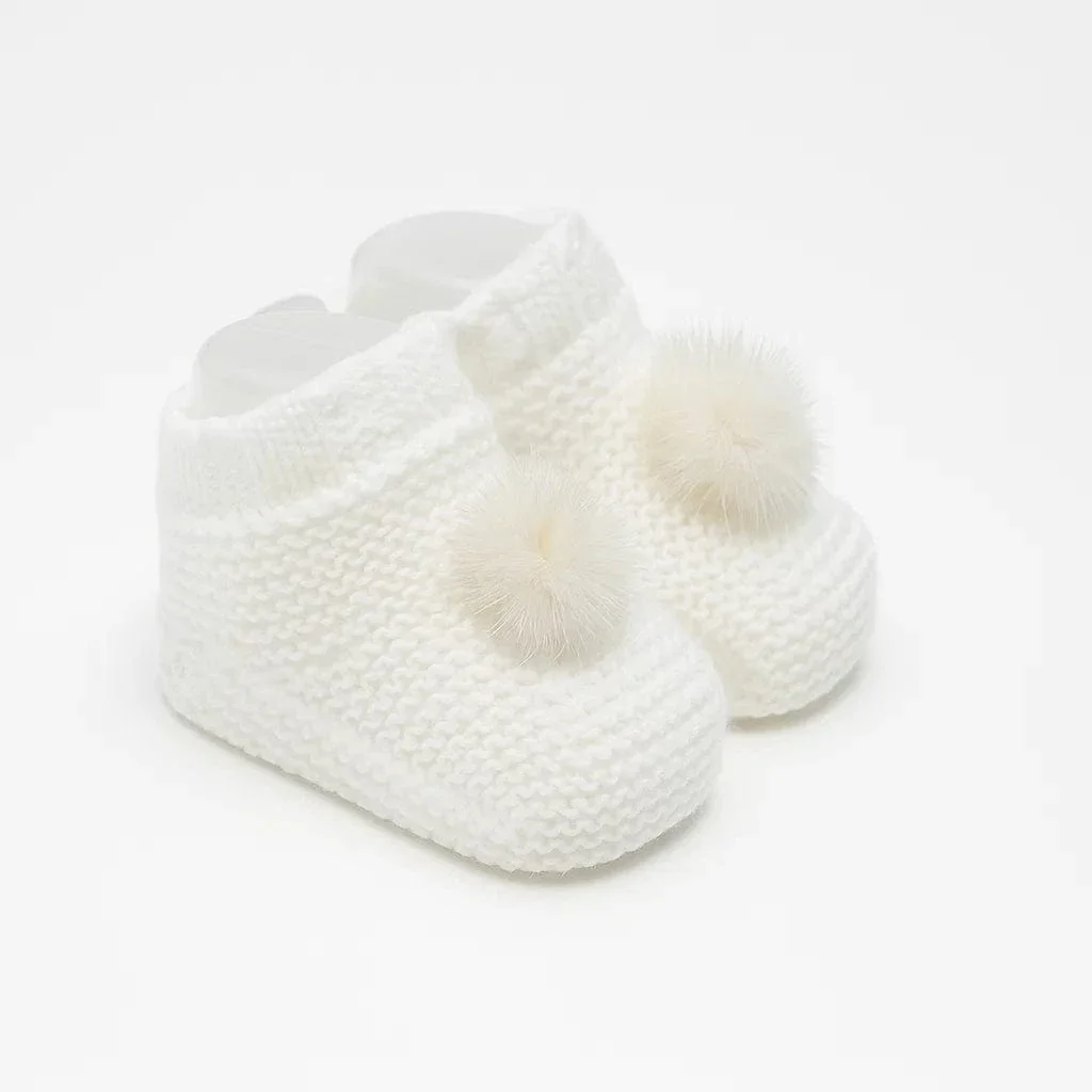 Babbucce in lana con risvolto e pompon, calde e delicate per neonata.