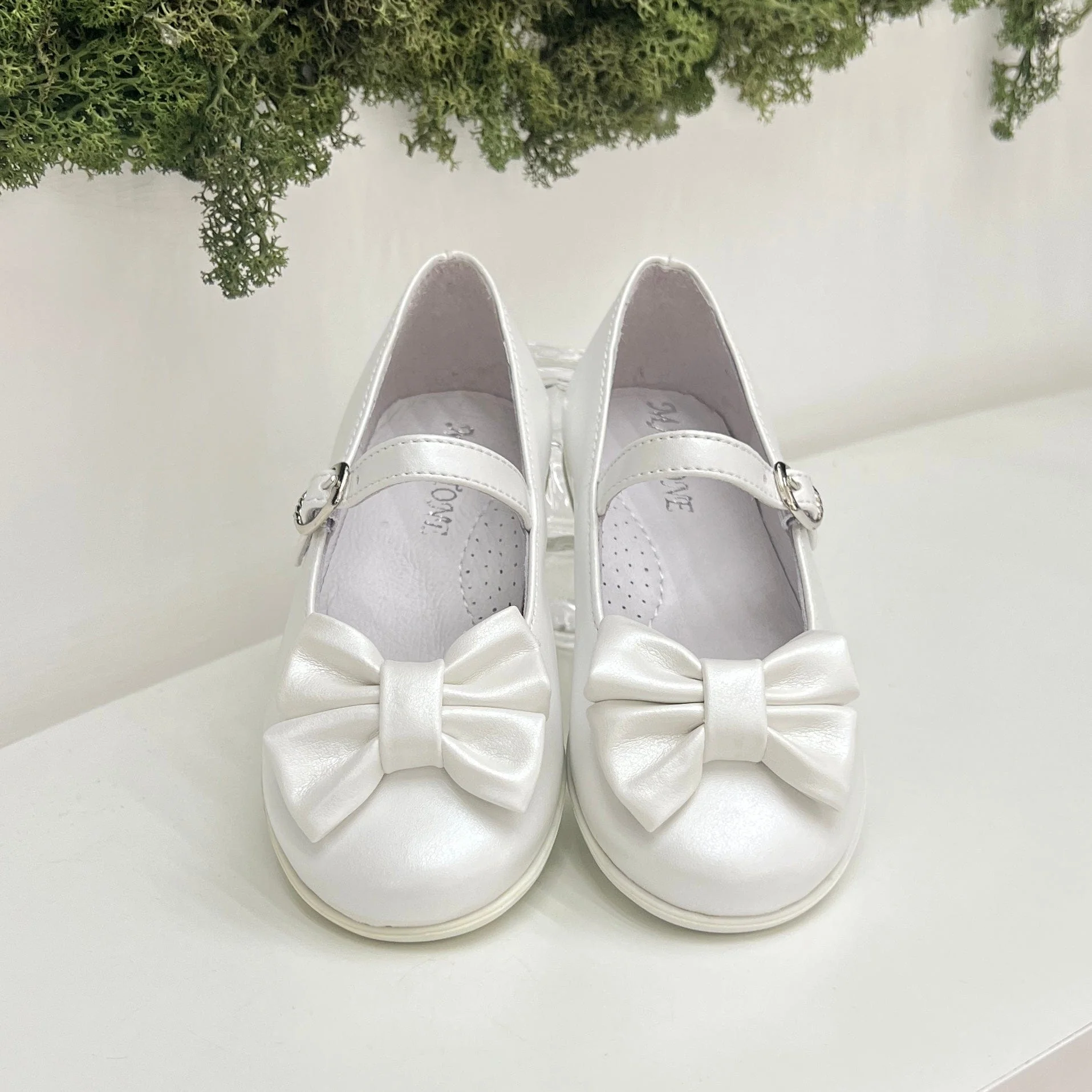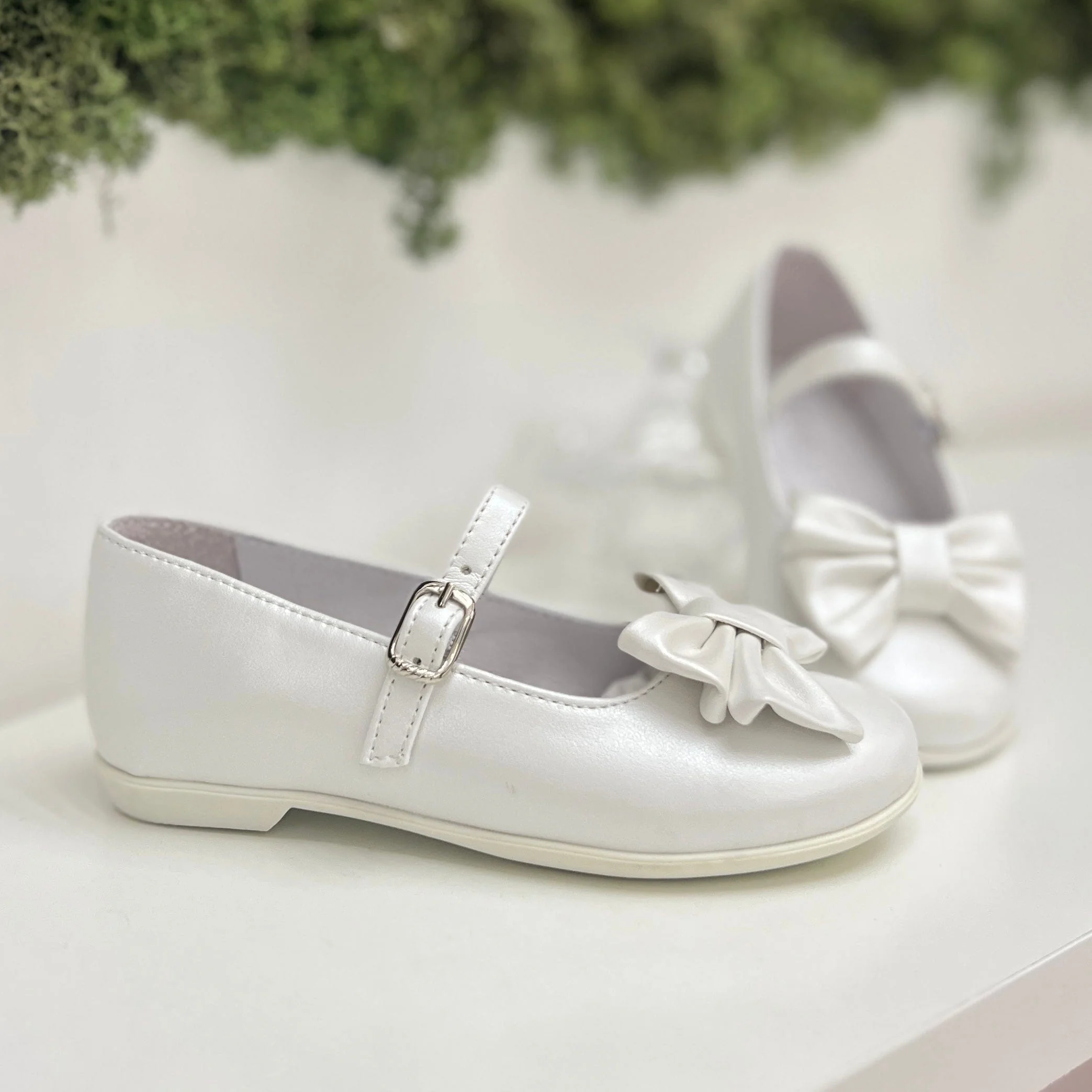 Ballerina in pelle bianco perlato con fiocchi, fondo in gomma antiscivolo e cinturino con fibbia.