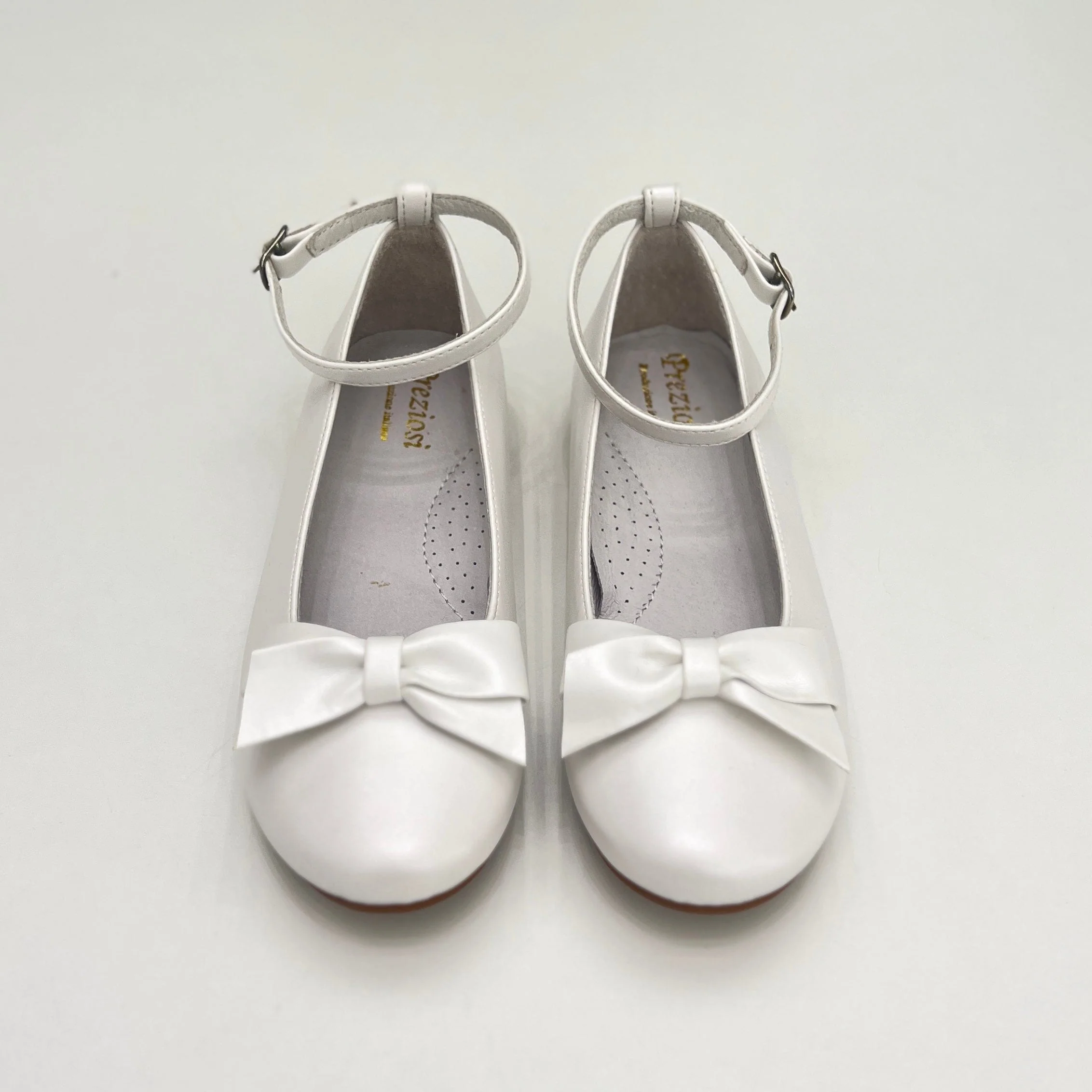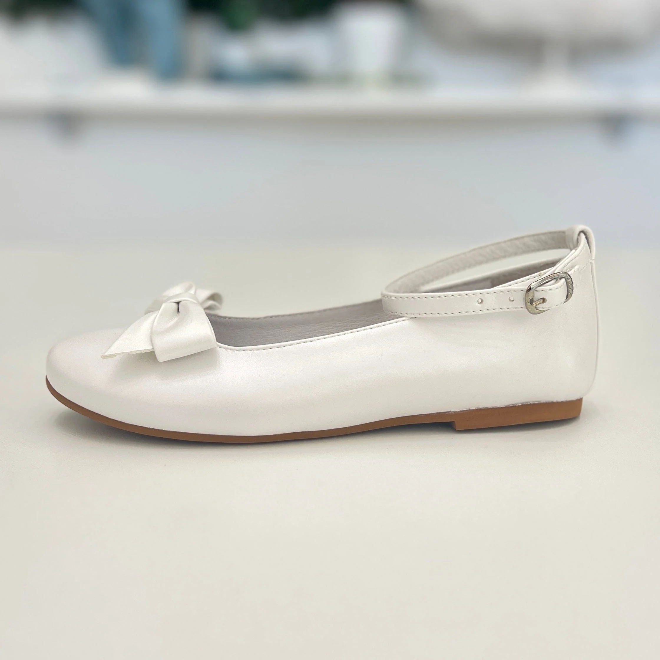 Ballerina bimba bianco perla in pelle con fiocchi e cinturino alla caviglia, raffinata e confortevole, perfetta per look eleganti. cod art: 2315 – doré bianco