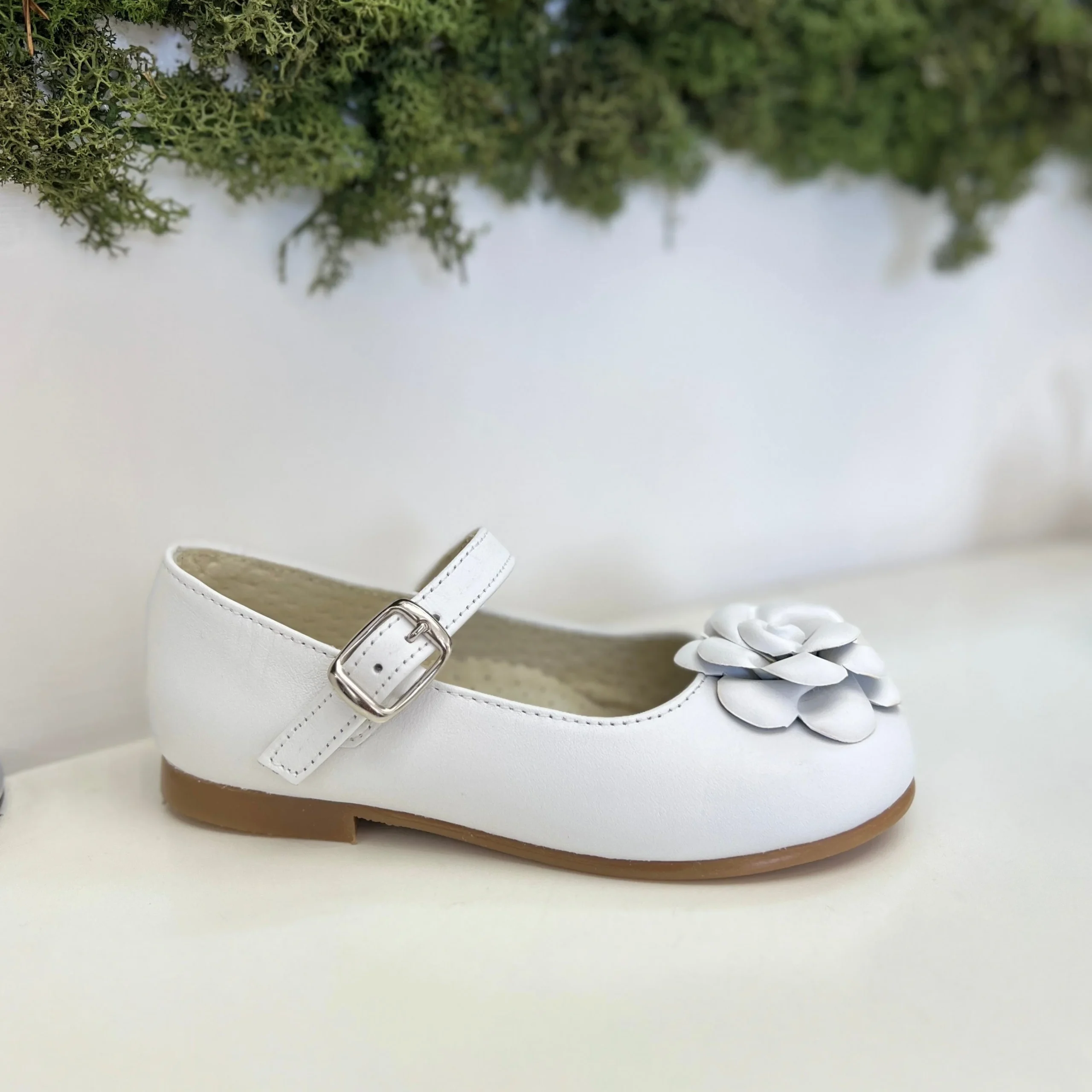 Ballerina con fiore in pelle, cinturino con fibbia regolabile e plantare anatomico con suola antiscivolo.