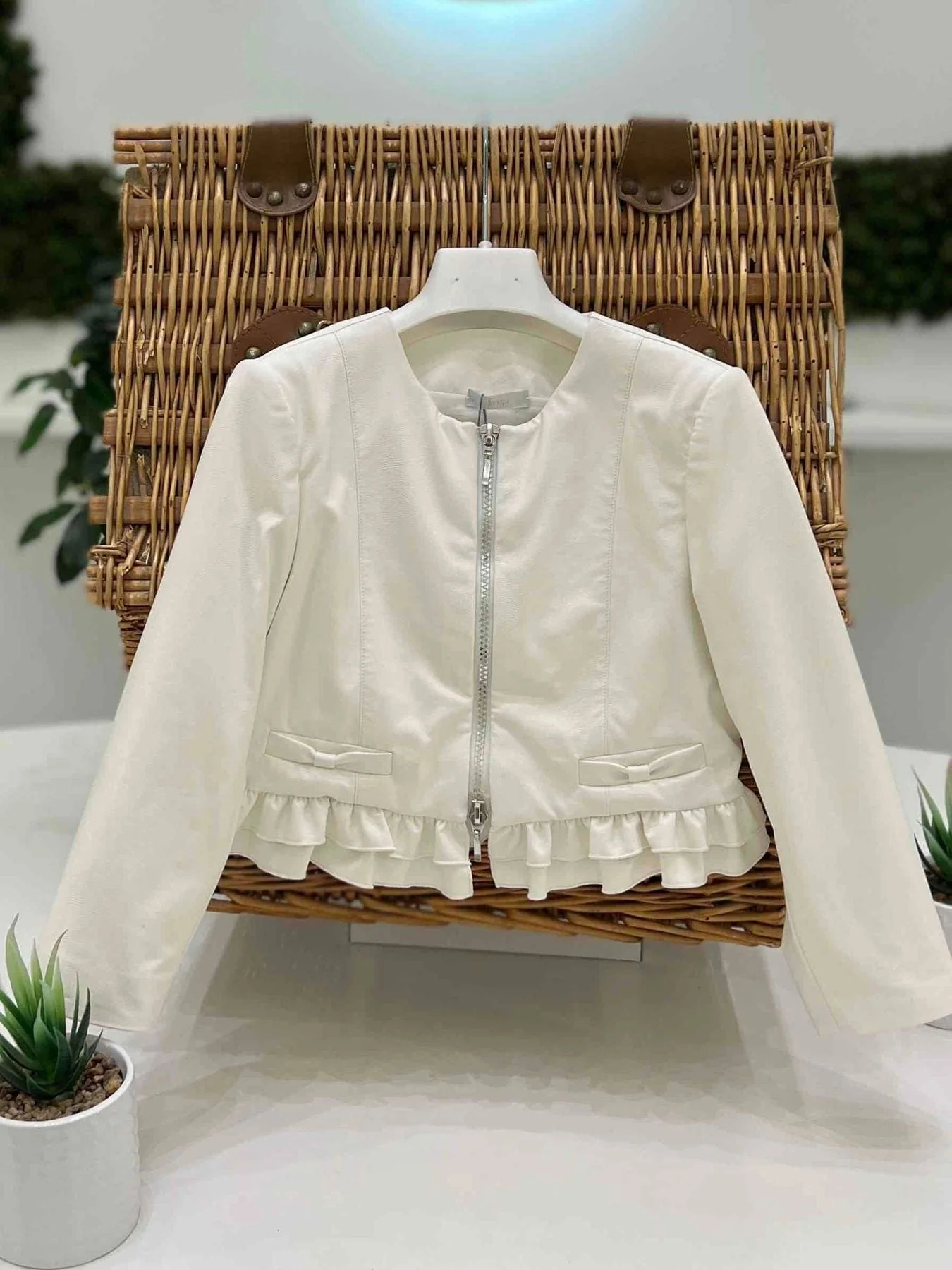 Giubbotto mezza stagione in ecopelle con rouches sull’orlo.