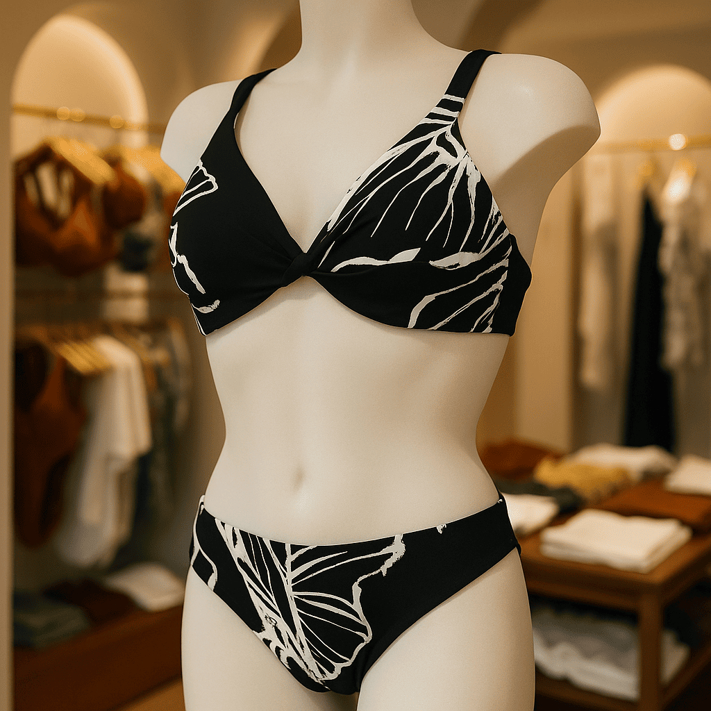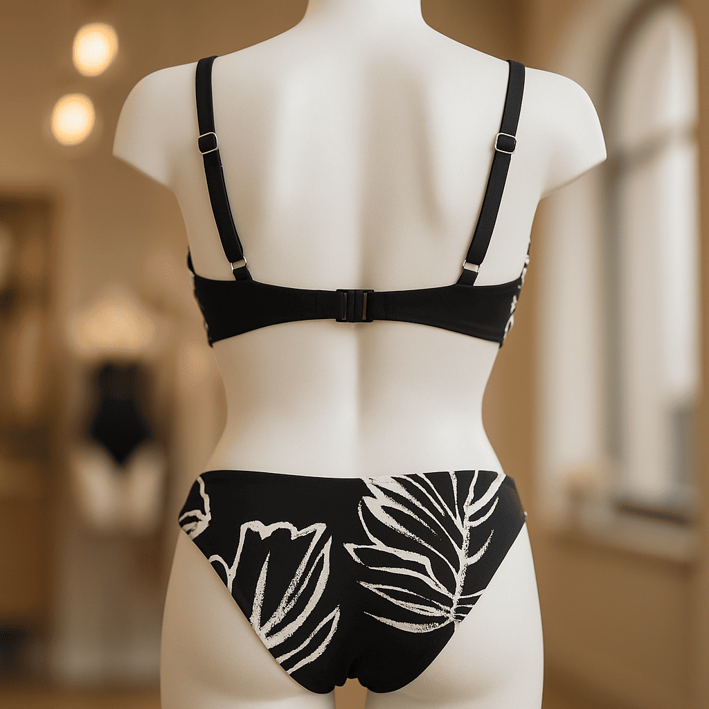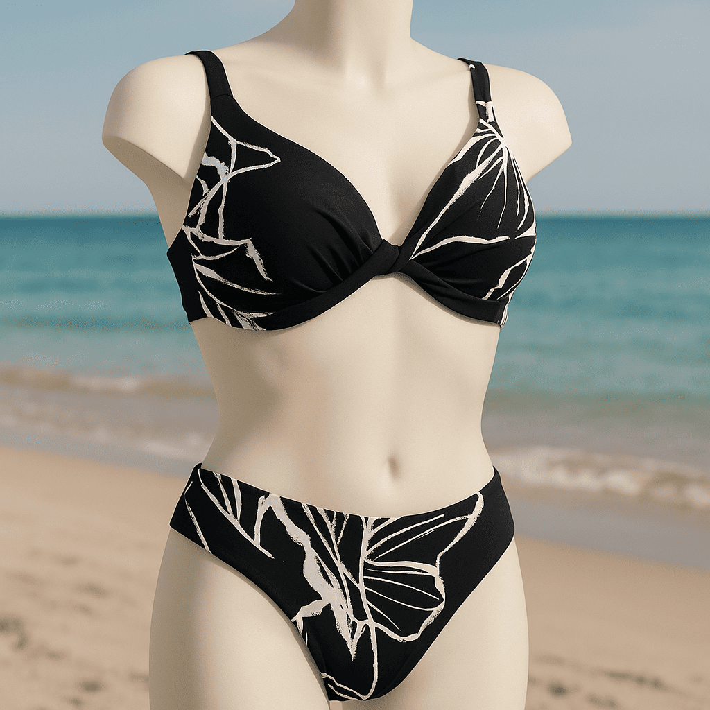 Questo bikini nero con stampa bianca geometrica/floreale è pensato per esaltare la tua femminilità in modo naturale, senza rinunciare al supporto.