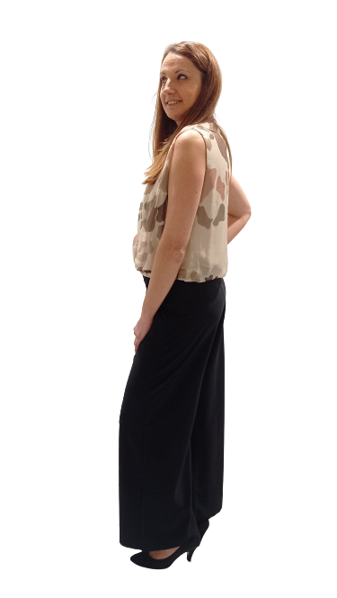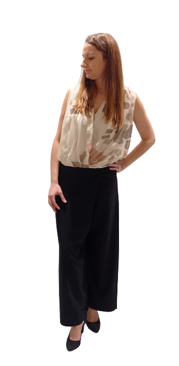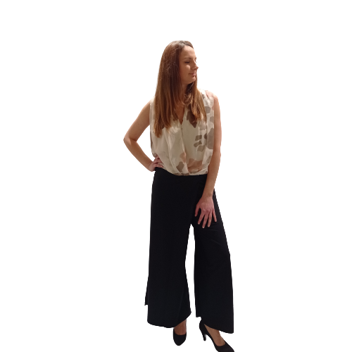 La puoi abbinare con un pantalone elegante, come in foto con il pantagonna ed e’ perfetta anche per piccole cerimomie o per apertivi e cene fuori.
