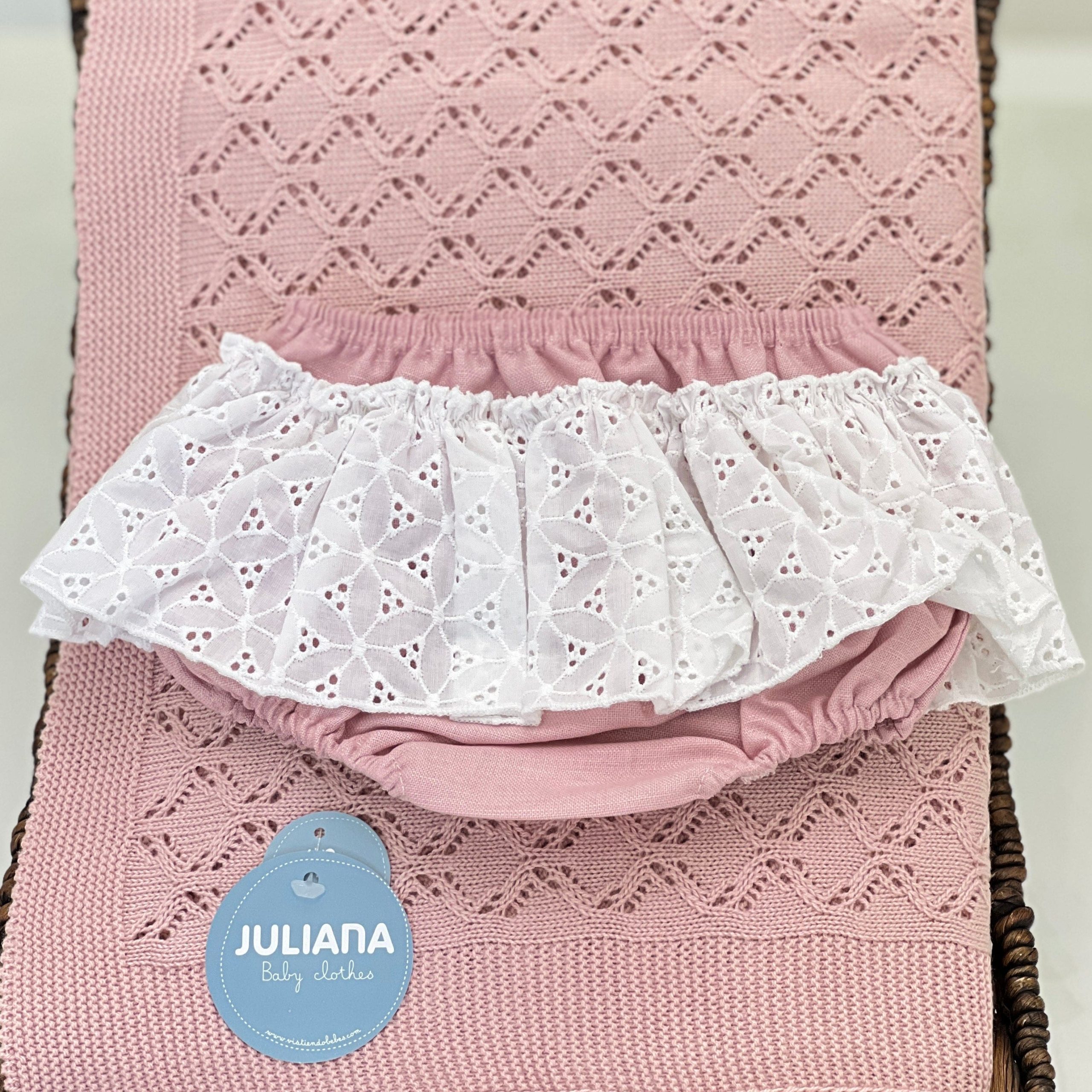 Completo per neonata composto da blusa in filo di cotone, manica ad aletta e colletto con rouches in sangallo, culotte in misto lino con rouches in sangallo. SKU: J25088Comp: Cotone/Acrilico/Lino