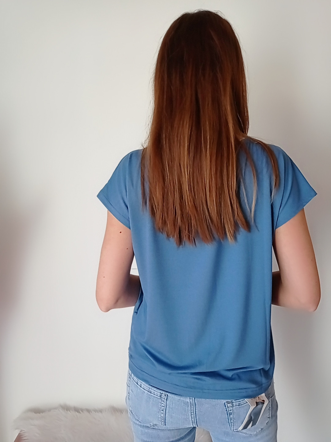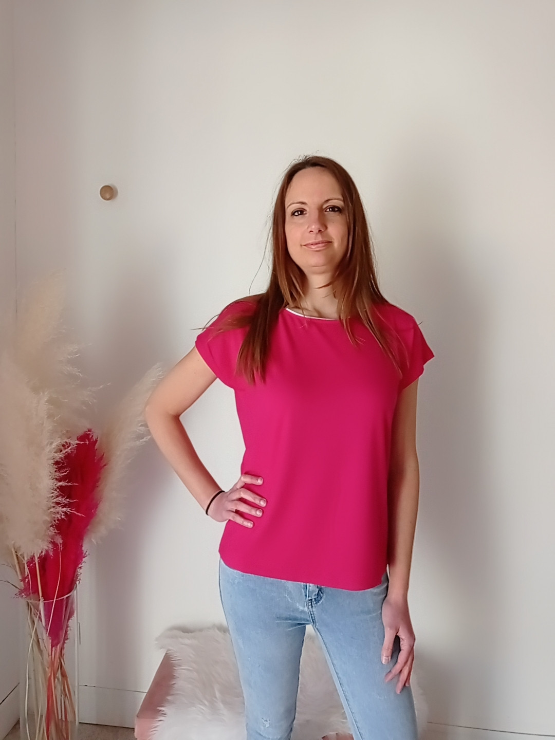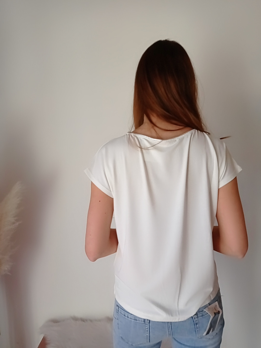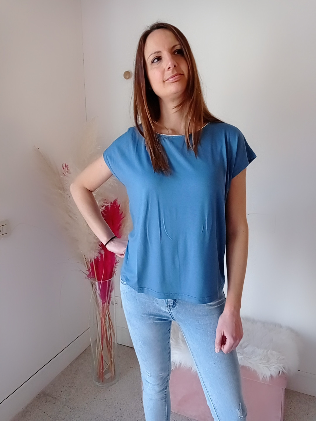 Blusa elegante in viscosa leggera con maniche corte e collo rifinito in argento. Disponibile in bianco, jeans e amarena. Fresca, elegante e facilissima da abbinare.