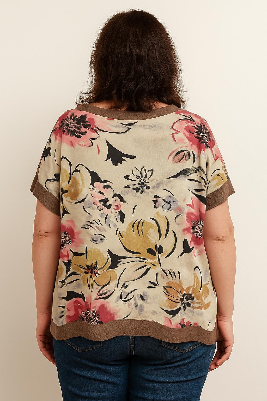 Blusa floreale acquerello con bordi marroni e bottoncini spalla – Taglio comodo