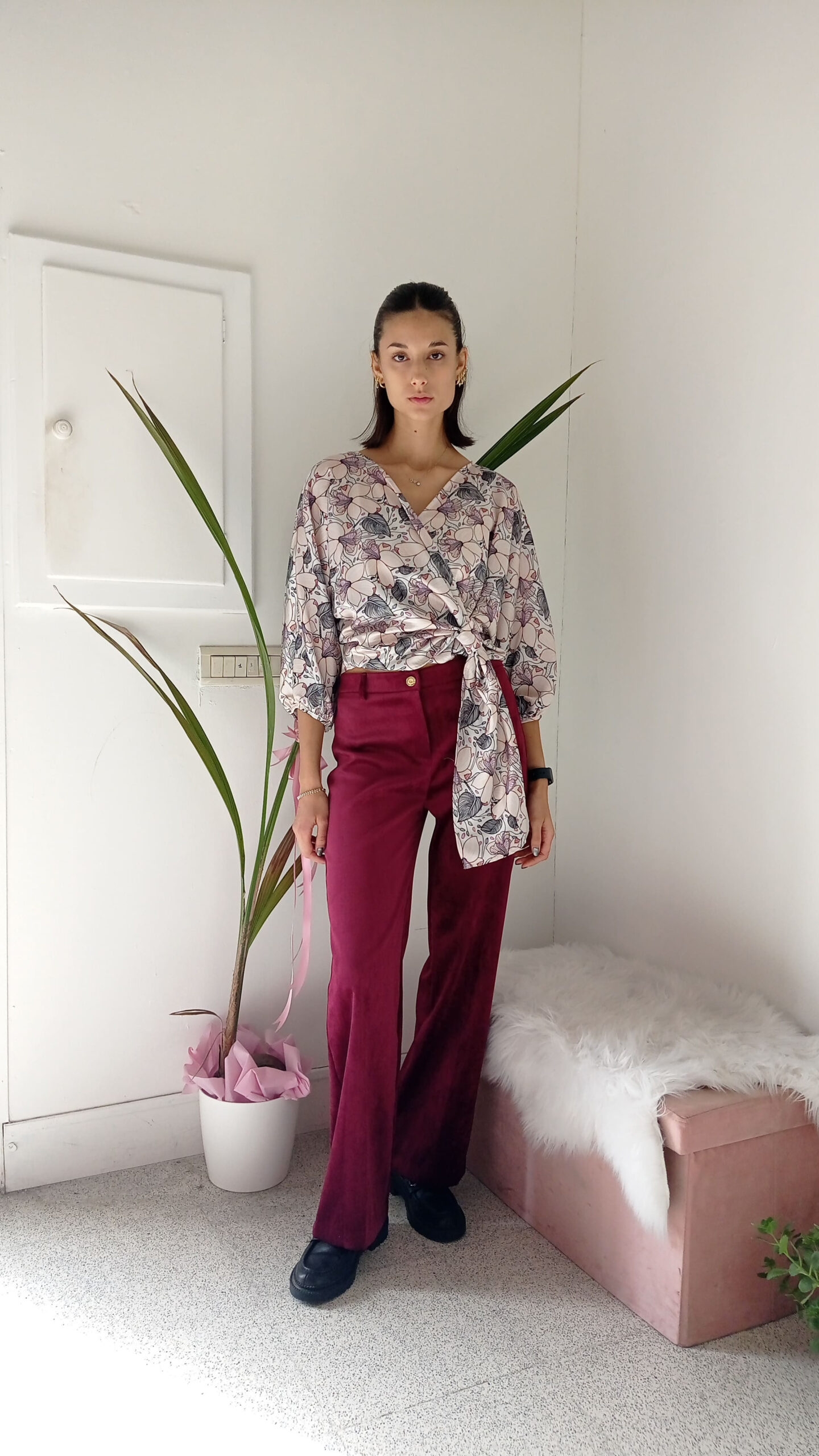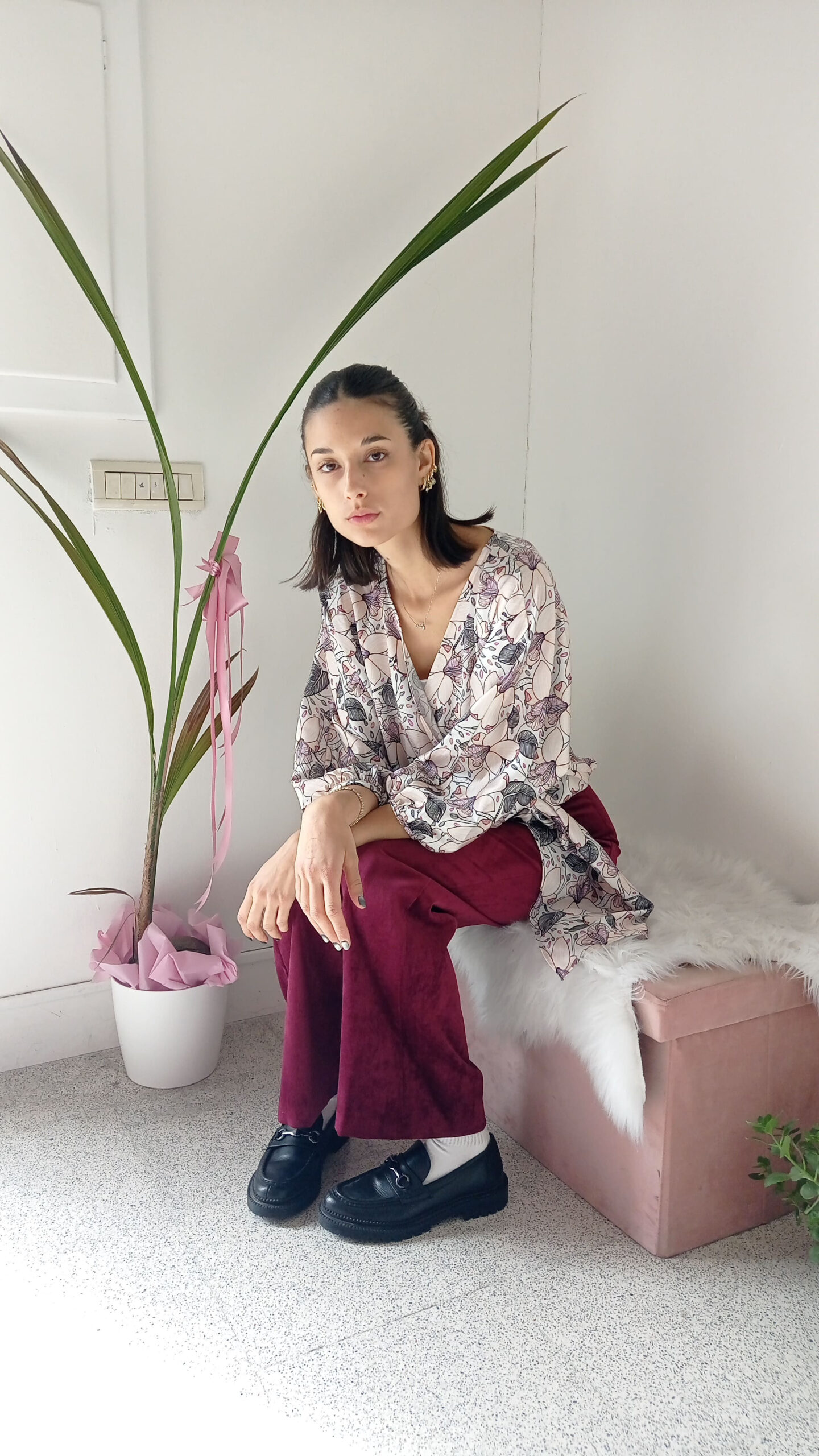 La stampa floreale tra grigio perla e rosa cipria aggiunge un tocco romantico, leggero e ricercato, perfetto per le mezze stagioni ma anche per dare luce alle giornate più fredde con il giusto abbinamento.