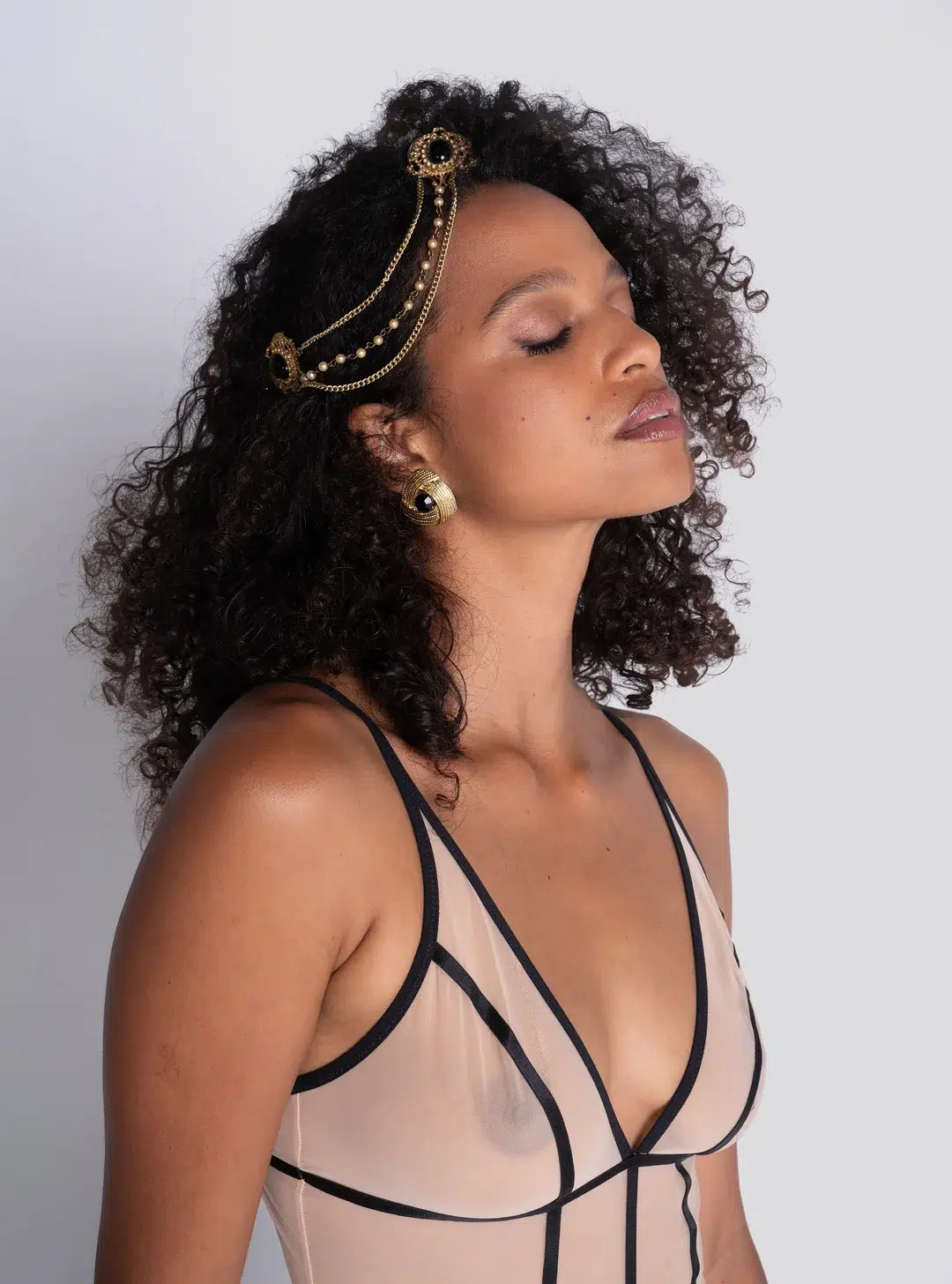 Materiale: Tulle elasticizzato nude con dettagli in contrasto neri