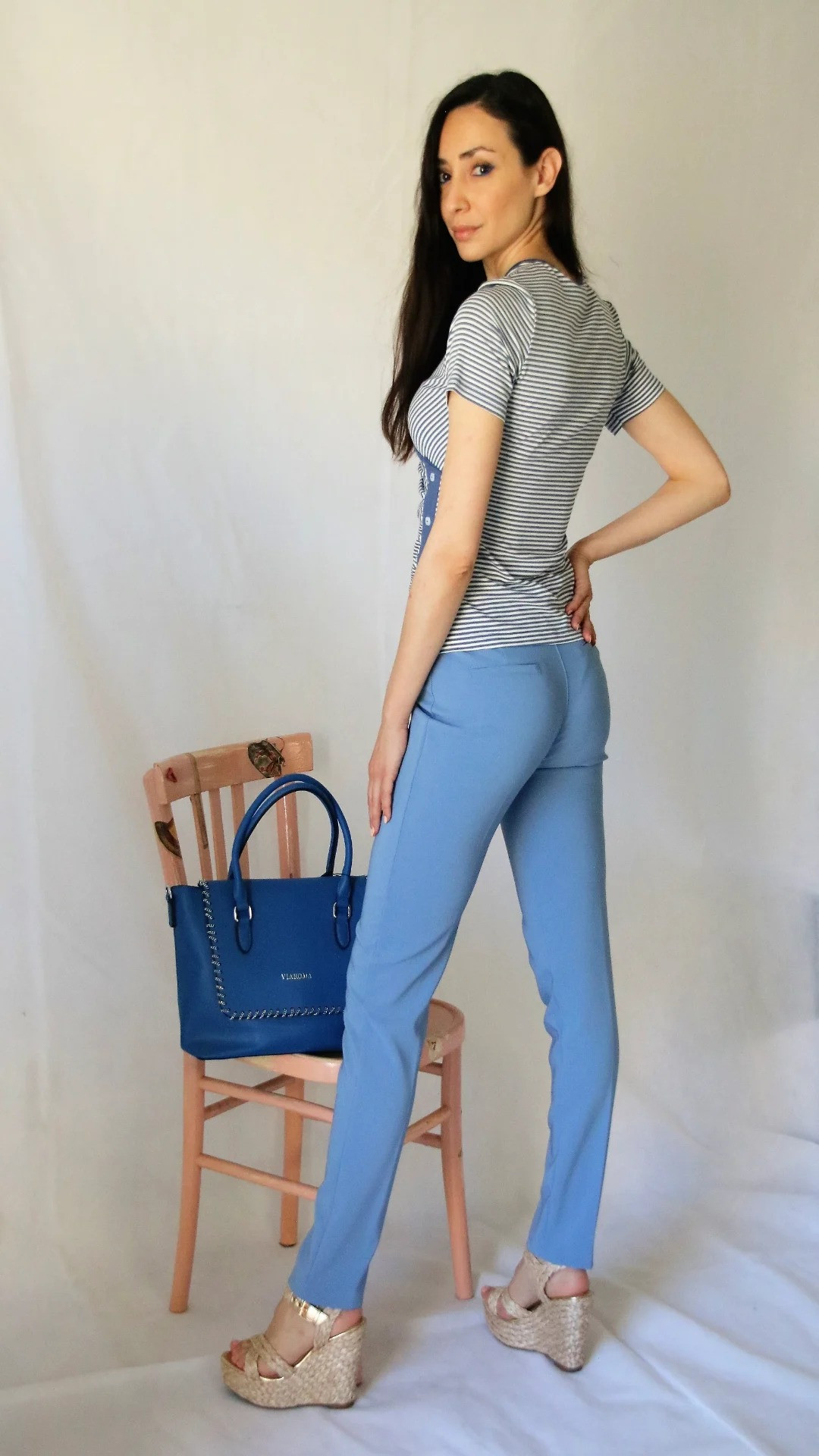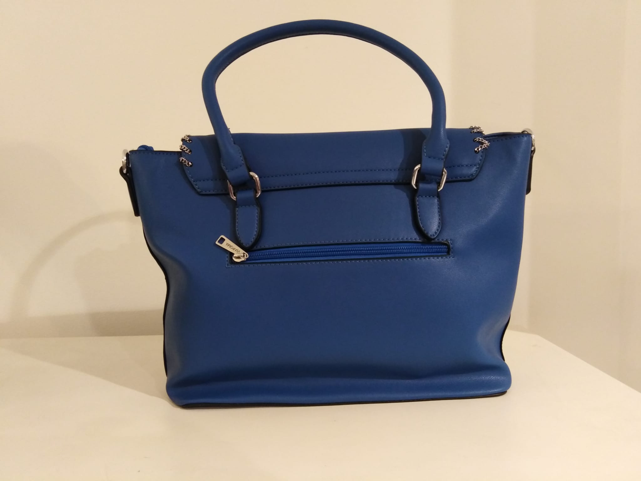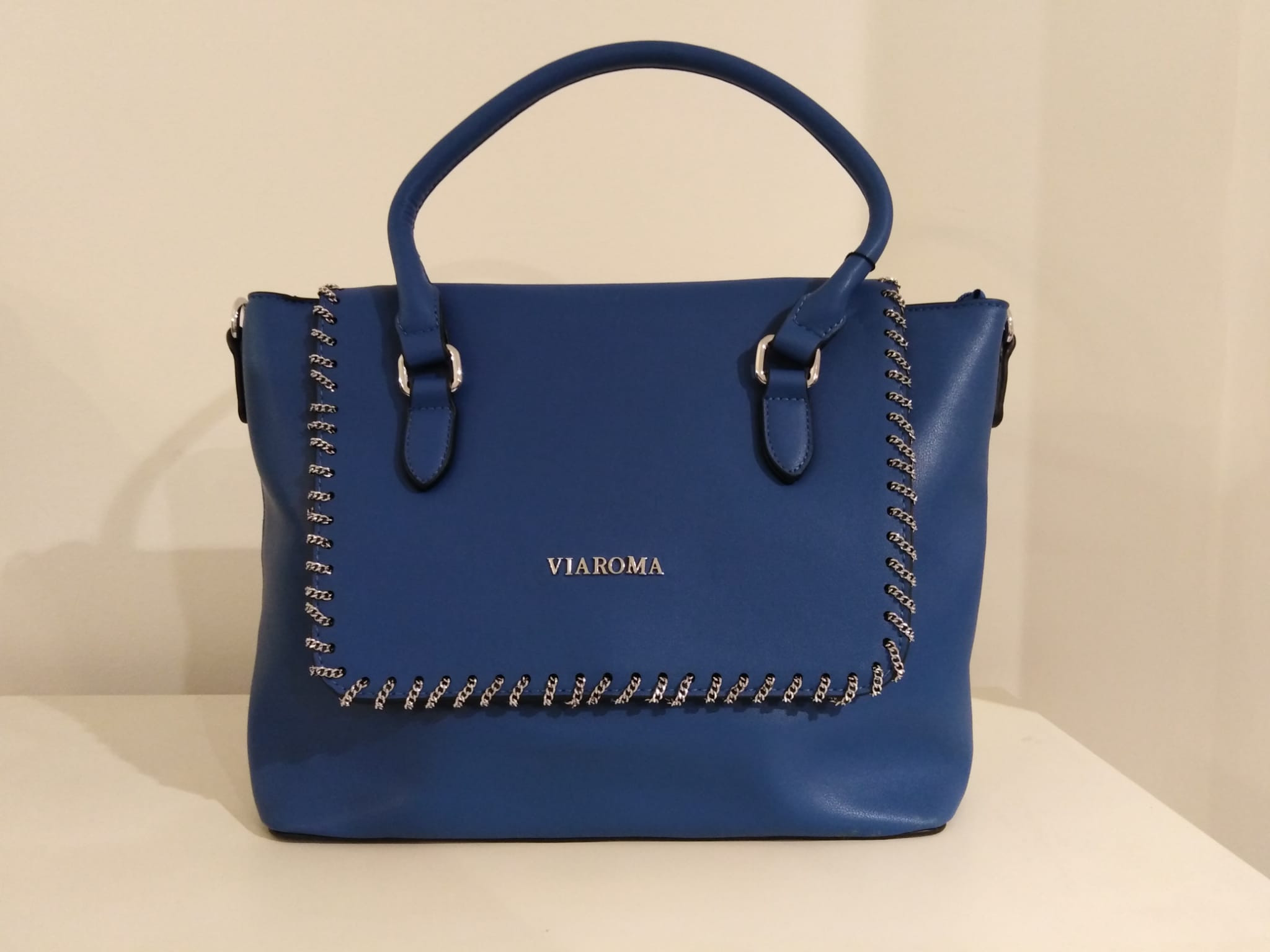 Borsa bauletto bluette da giorno, con possibilità di aggiungere la tracolla.