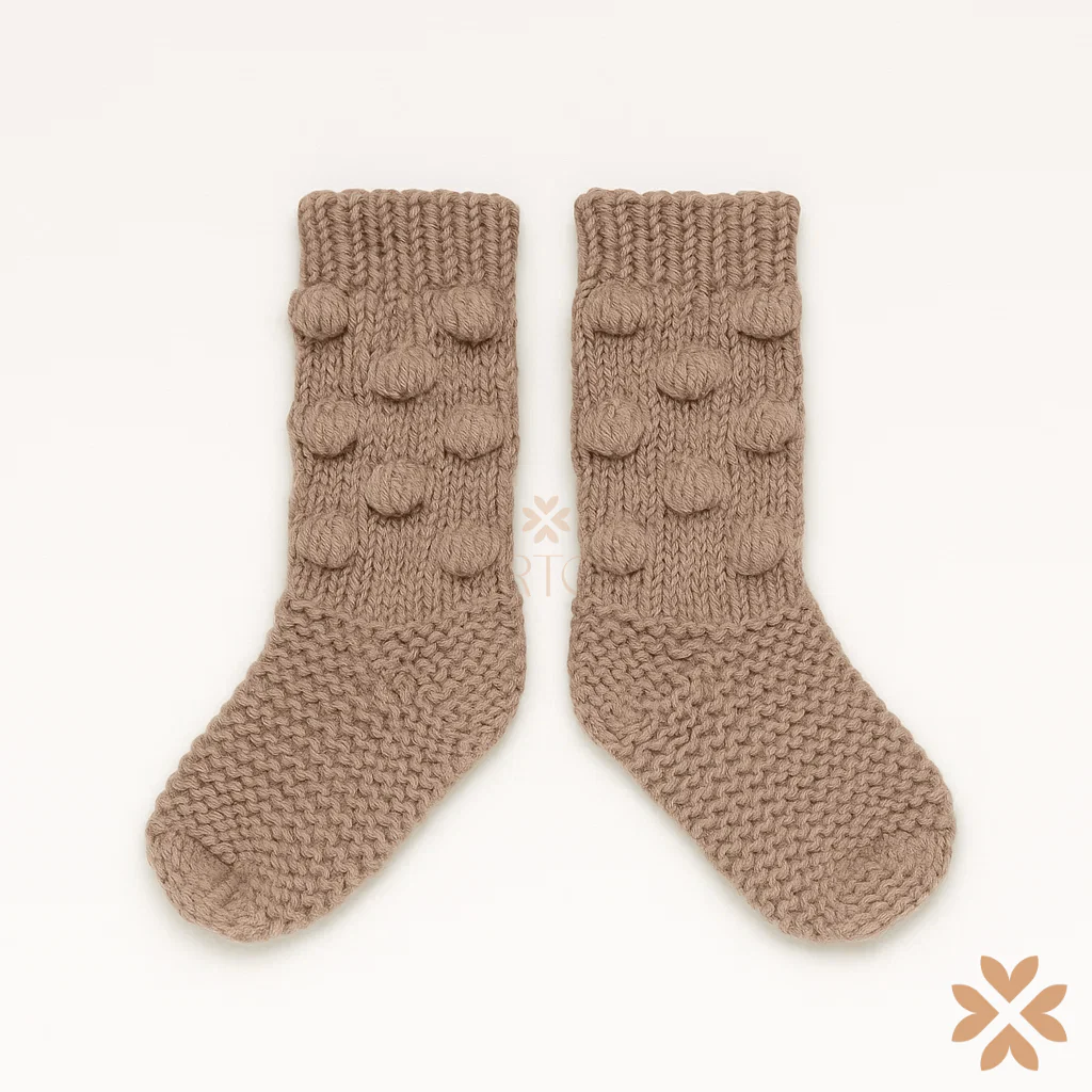 Calzettoni in maglia beige con nodini decorativi. Modello morbido ed elasticizzato, perfetto per completare con eleganza i look della prima infanzia. comp: 100% cotonecod art: 5325