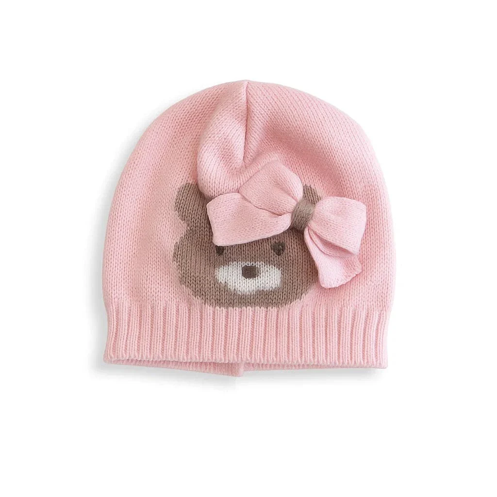 Cappellino in maglia intrecciata color rosa con fiocco in lana e inserto in tela con orsetto ricamato. Morbido e coordinato alla tutina. comp: 100% lanacod art: 3509.99