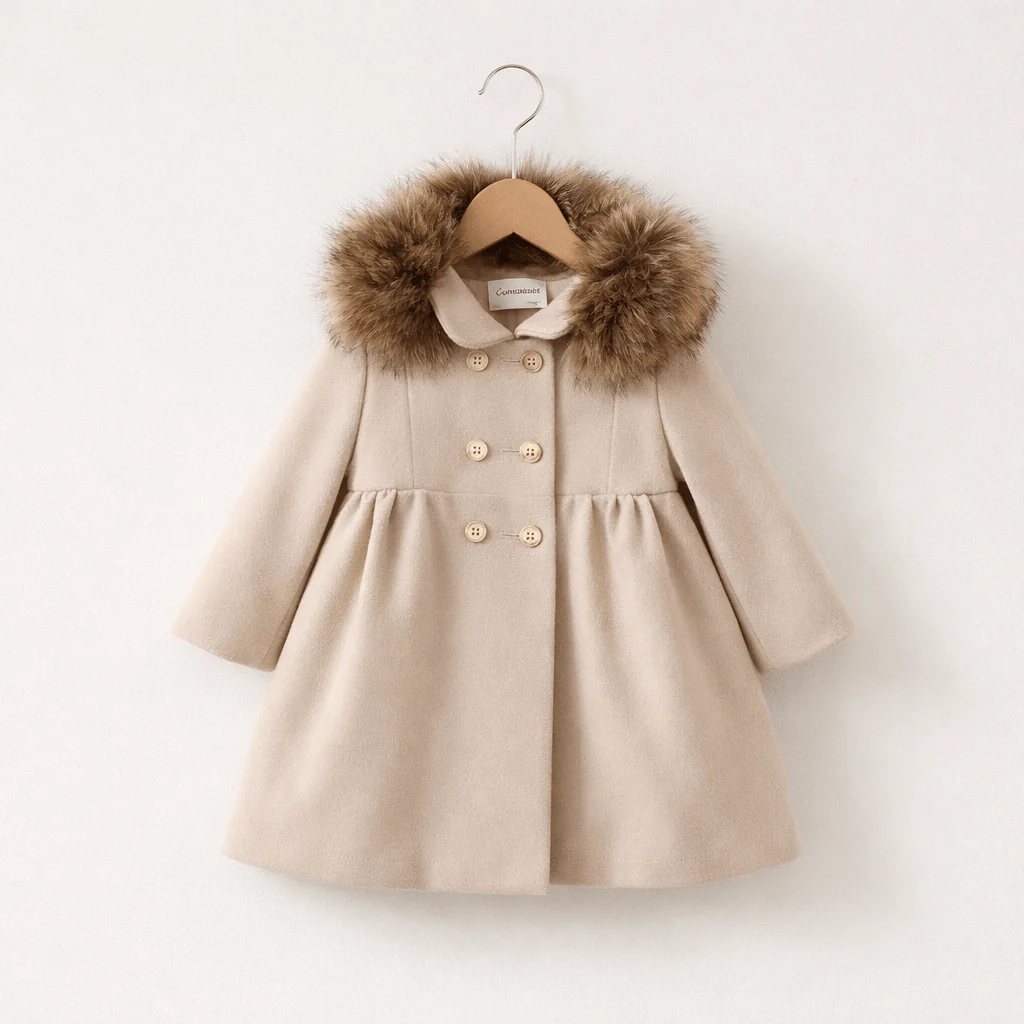 Cappottino per neonata dal design raffinato e senza tempo, realizzato in tonalità neutra e luminosa. Linea svasata con taglio sotto il petto, chiusura doppiopetto con bottoni decorativi e maniche lunghe. Il cappuccio è impreziosito da un elegante profilo in eco-pelliccia, che dona carattere e protezione. Un capo curato nei dettagli, perfetto per cerimonie invernali e occasioni speciali.