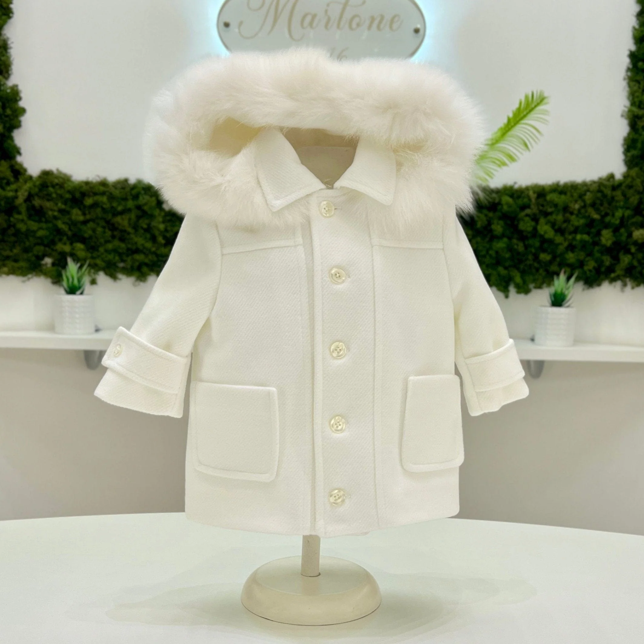Cappotto in panno con bottoni in madreperla, tasche frontali in rilievo, cappuccio con ecopelliccia.
