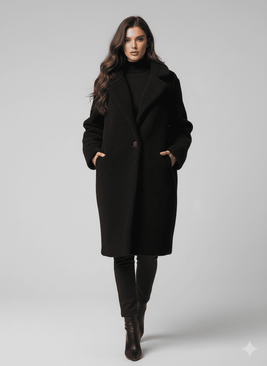 Questo cappotto in pelliccia ecologica ricciolina nera è uno di quelli: essenziale all’esterno, sorprendente all’interno, pensato per donne che amano sentirsi protette, eleganti e forti senza rinunciare allo stile.