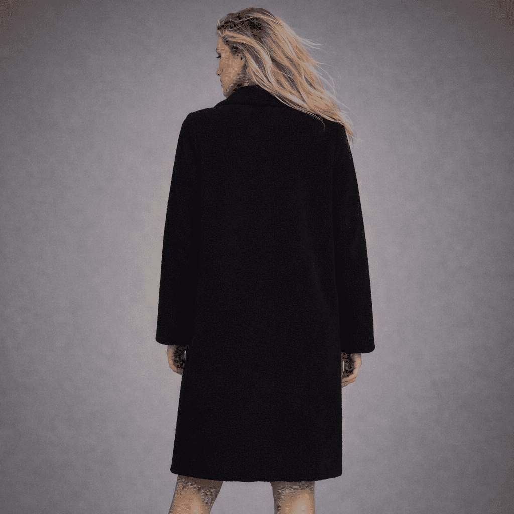 La linea è pulita e femminile, con lunghezza sotto il ginocchio che slancia la figura e avvolge il corpo come un abbraccio caldo. Il tessuto effetto bouclé ricciolino è morbido, corposo e raffinato, perfetto per l’inverno e le mezze stagioni più fredde.