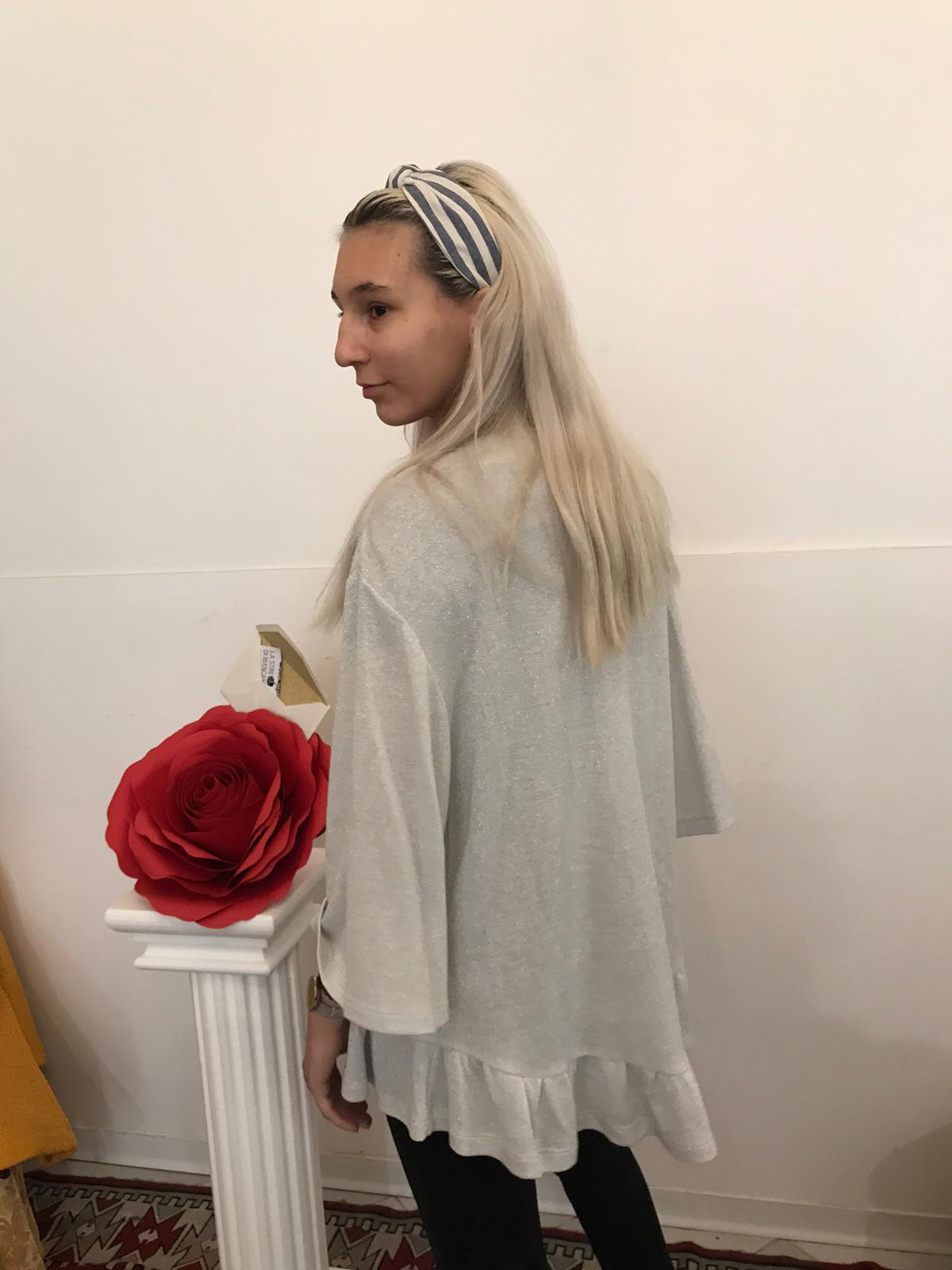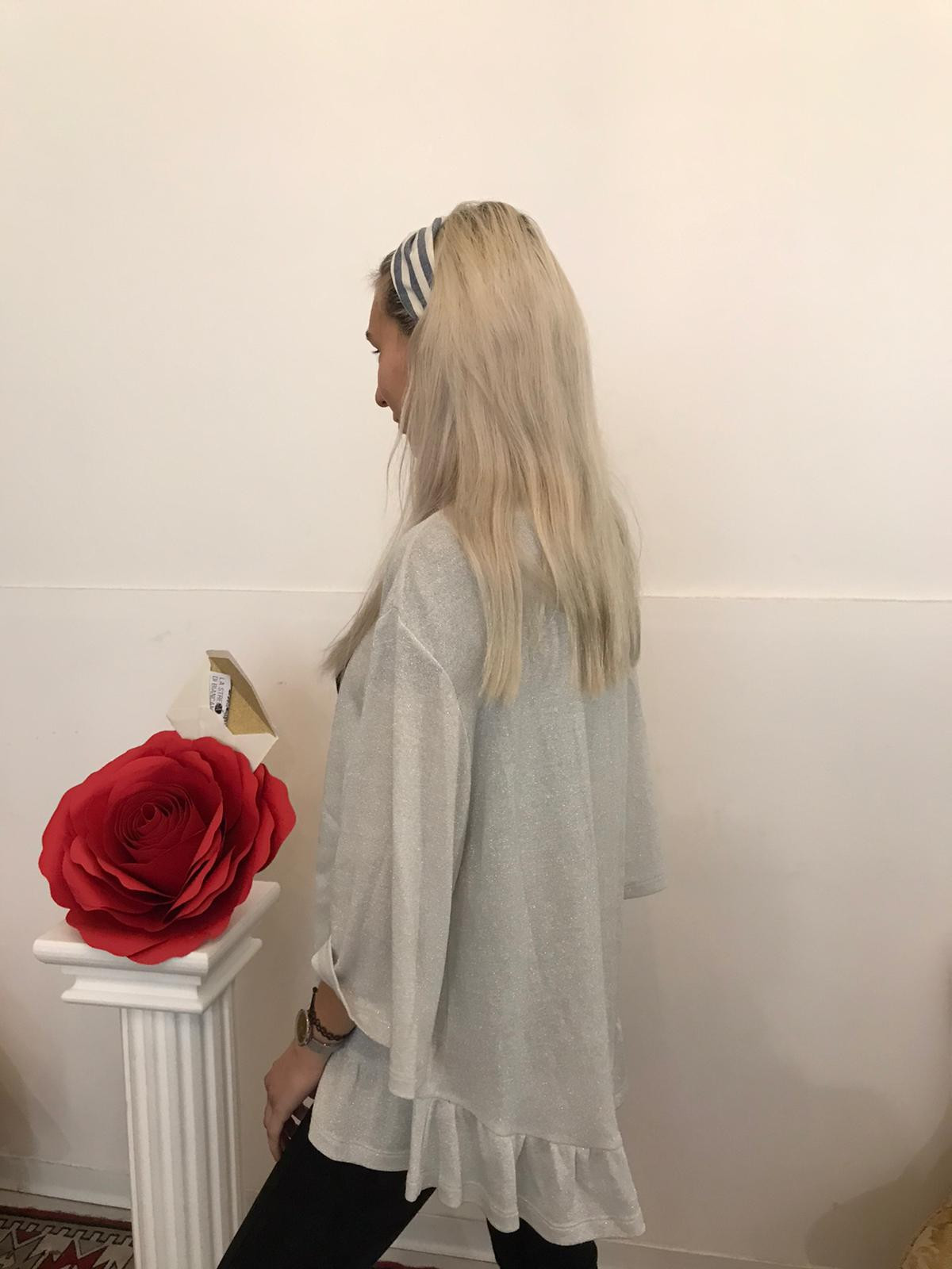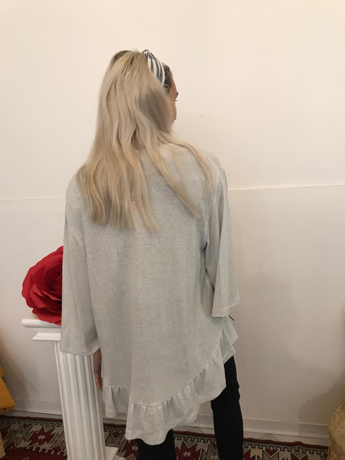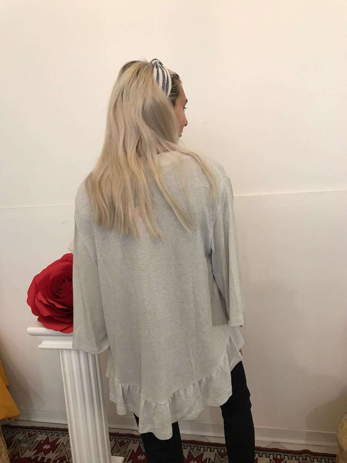cardigana grigio argento con lurex asimmetrico