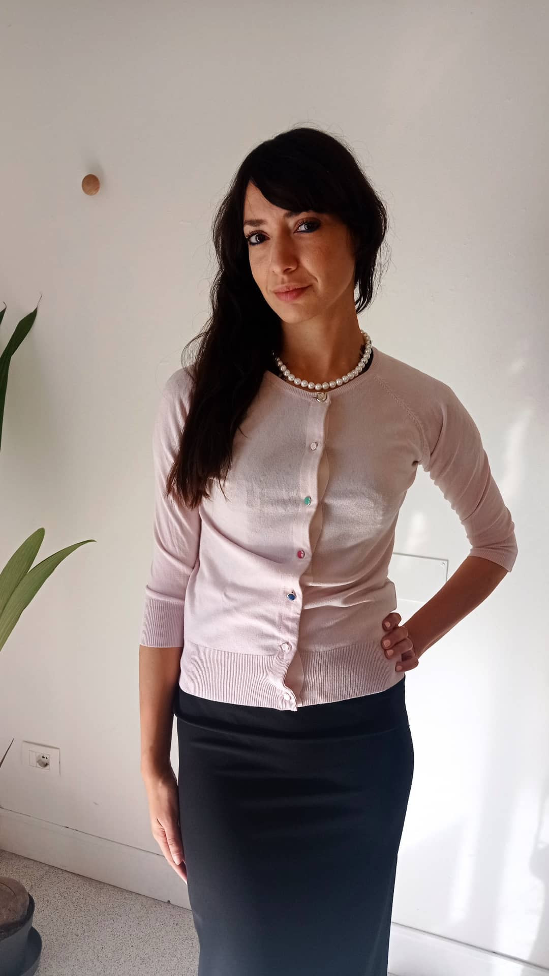 Cardigan in viscosa in un delicato tono pastello con bottoni gioiello uno diverso dall’altro.