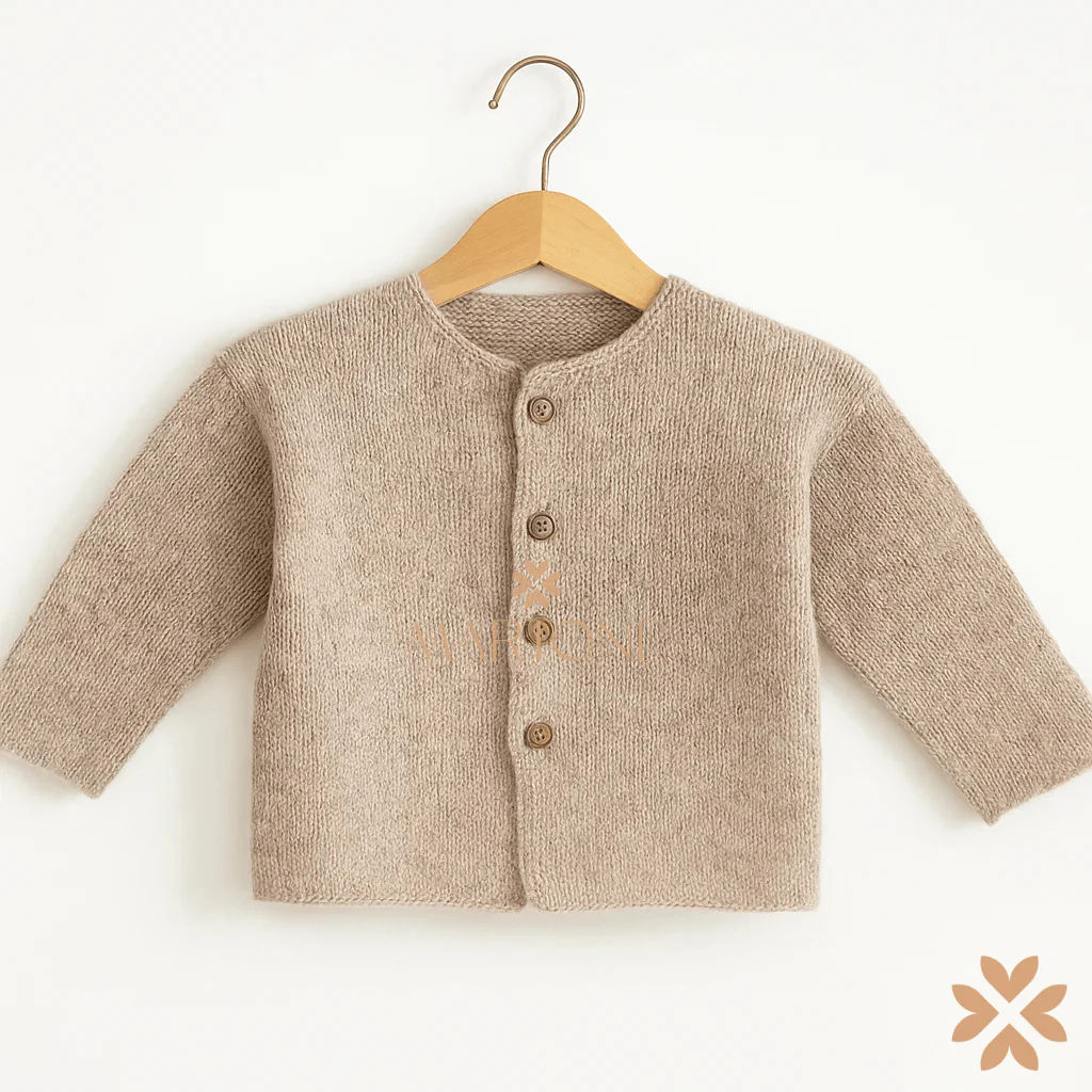 Cardigan in maglia beige melange con maniche lunghe, scollo tondo e apertura frontale con bottoni in legno. Rifinito con bordi dritti su fondo e polsini. comp: 100% lana merinocod art: I250330B.59
