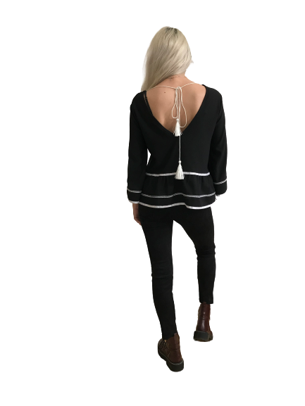 Splendida casacca nera e bianca con scollo a V sulla schiena, galetta e rifinita con pendenti nel retro.