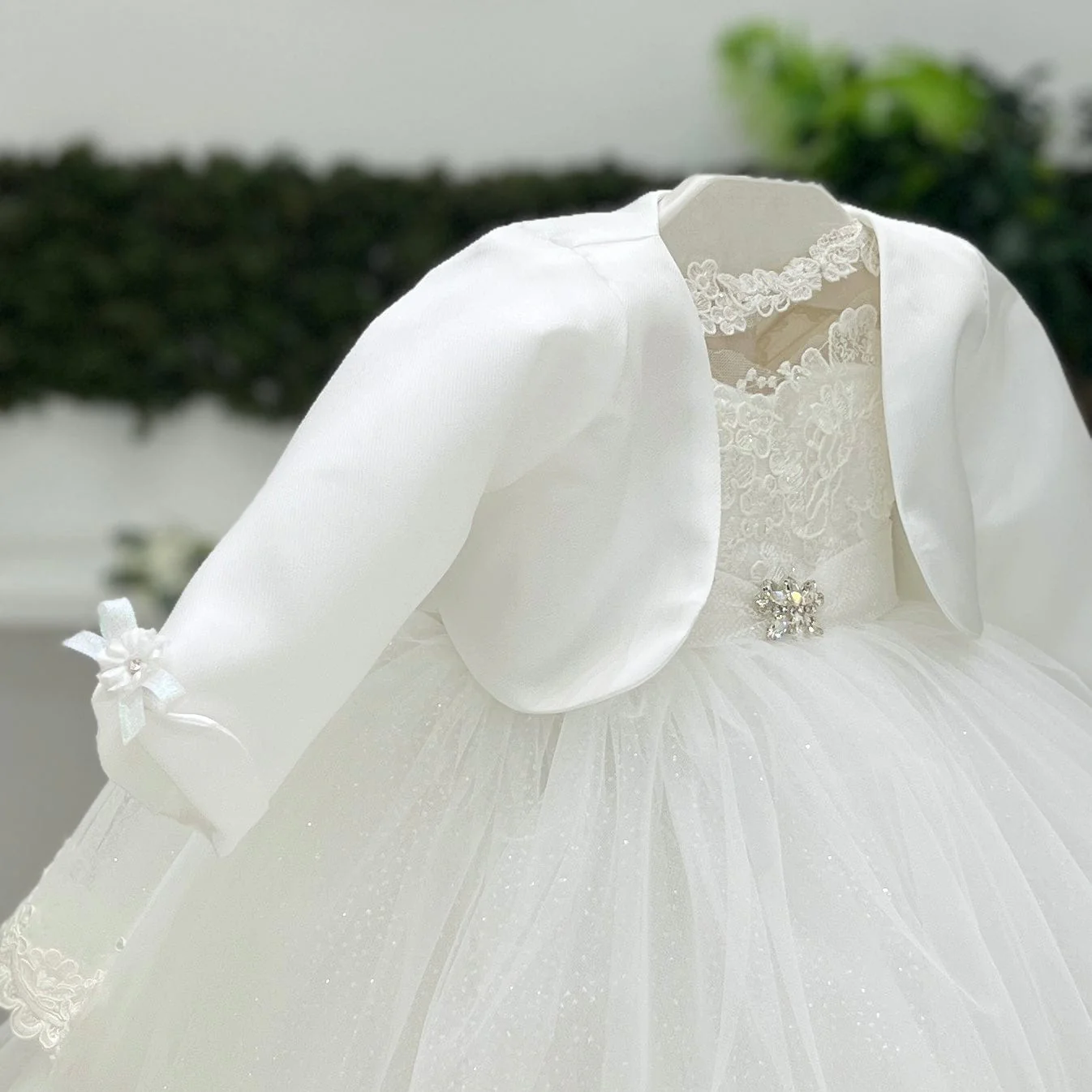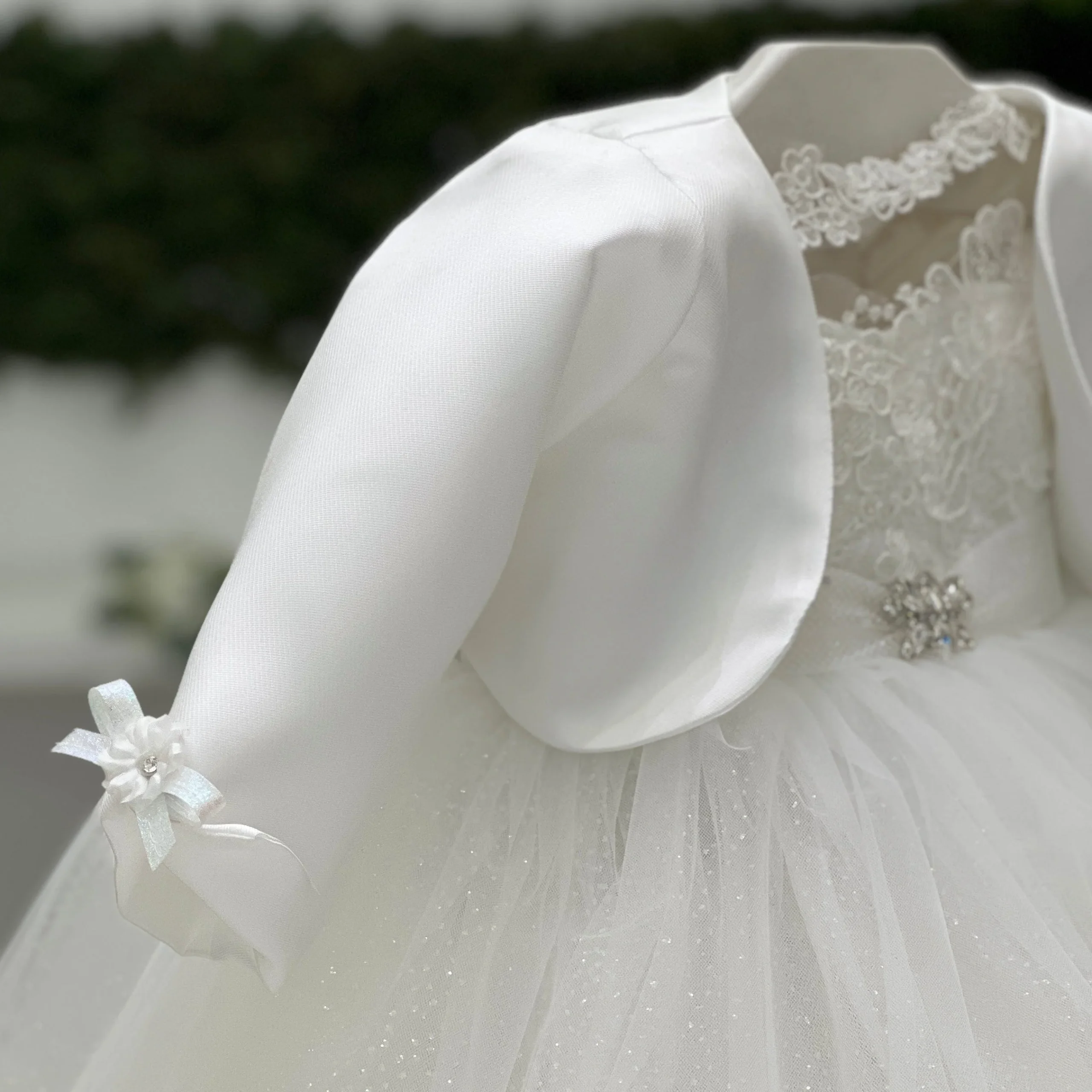 Un coprispalle in mikado elegante e raffinato, con maniche a risvolto e una delicata applicazione con spilla a fiore su ogni manica. Perfetto per aggiungere un tocco di classe a qualsiasi look da cerimonia.