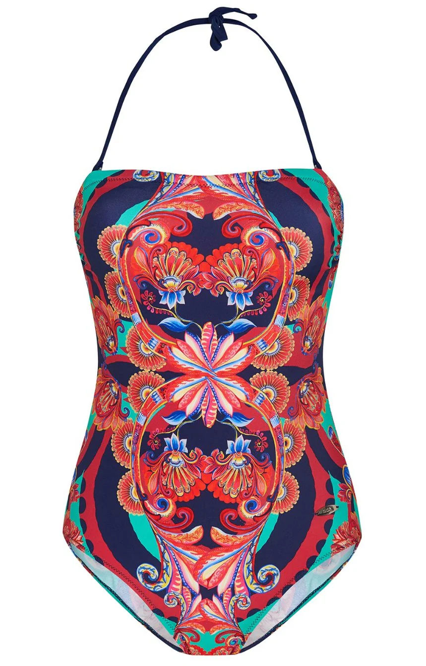 Bikini a vita alta multicolor con reggiseno a fascia con ferretto.