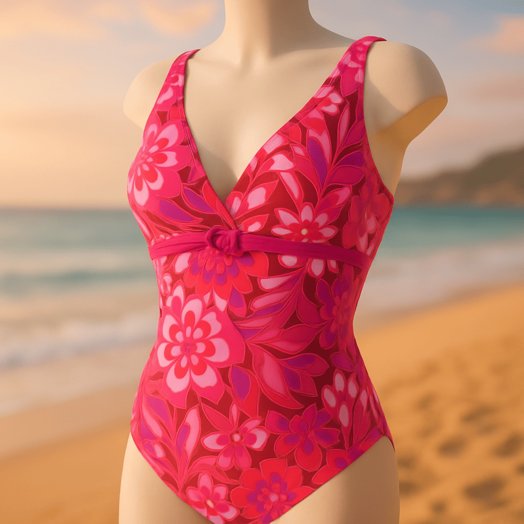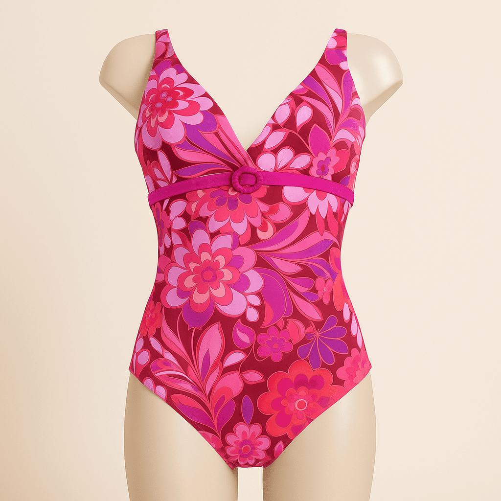 Costume intero floreale nei toni del rosa e rosso con scollo a V e dettaglio in vita. Comfort assoluto, tessuto tecnico e design femminile. Disponibile in quantità limitata.
