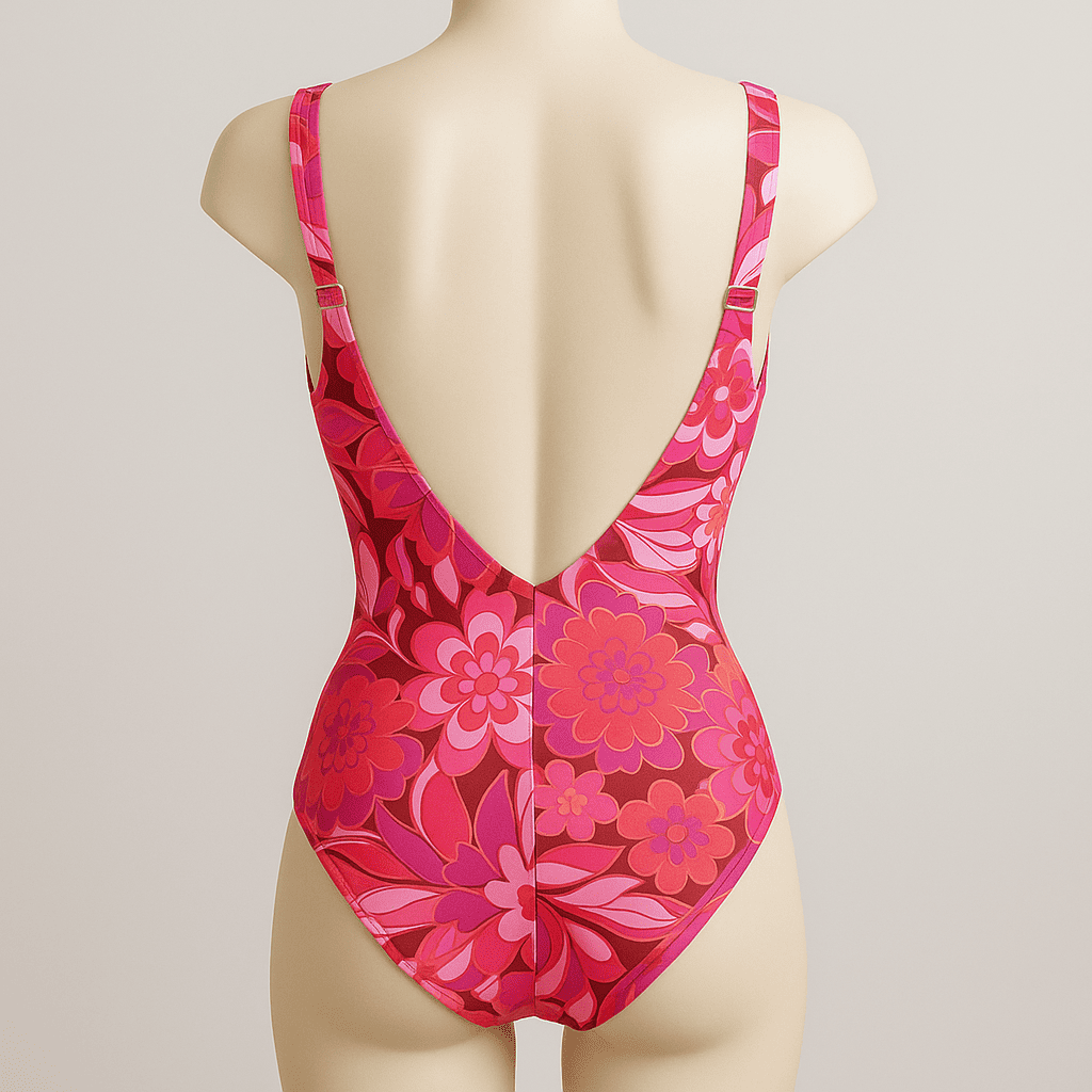 Il design richiama il fascino vintage degli anni ’70, reinterpretato in chiave moderna: fiori grandi e vivaci nelle tonalità del rosa, fucsia e rosso si intrecciano in un’esplosione di energia positiva. Indossarlo significa non solo valorizzare il tuo corpo, ma anche trasmettere gioia, vitalità e sicurezza interiore.