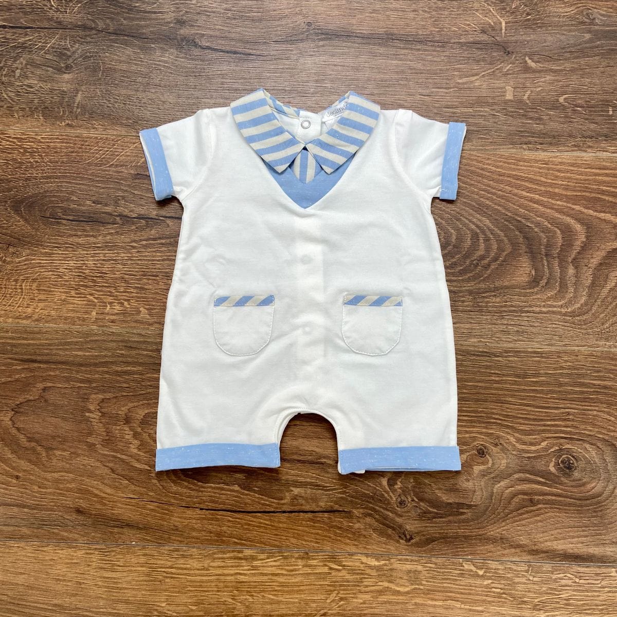 Tutina corta con finta camicia e taschini.
