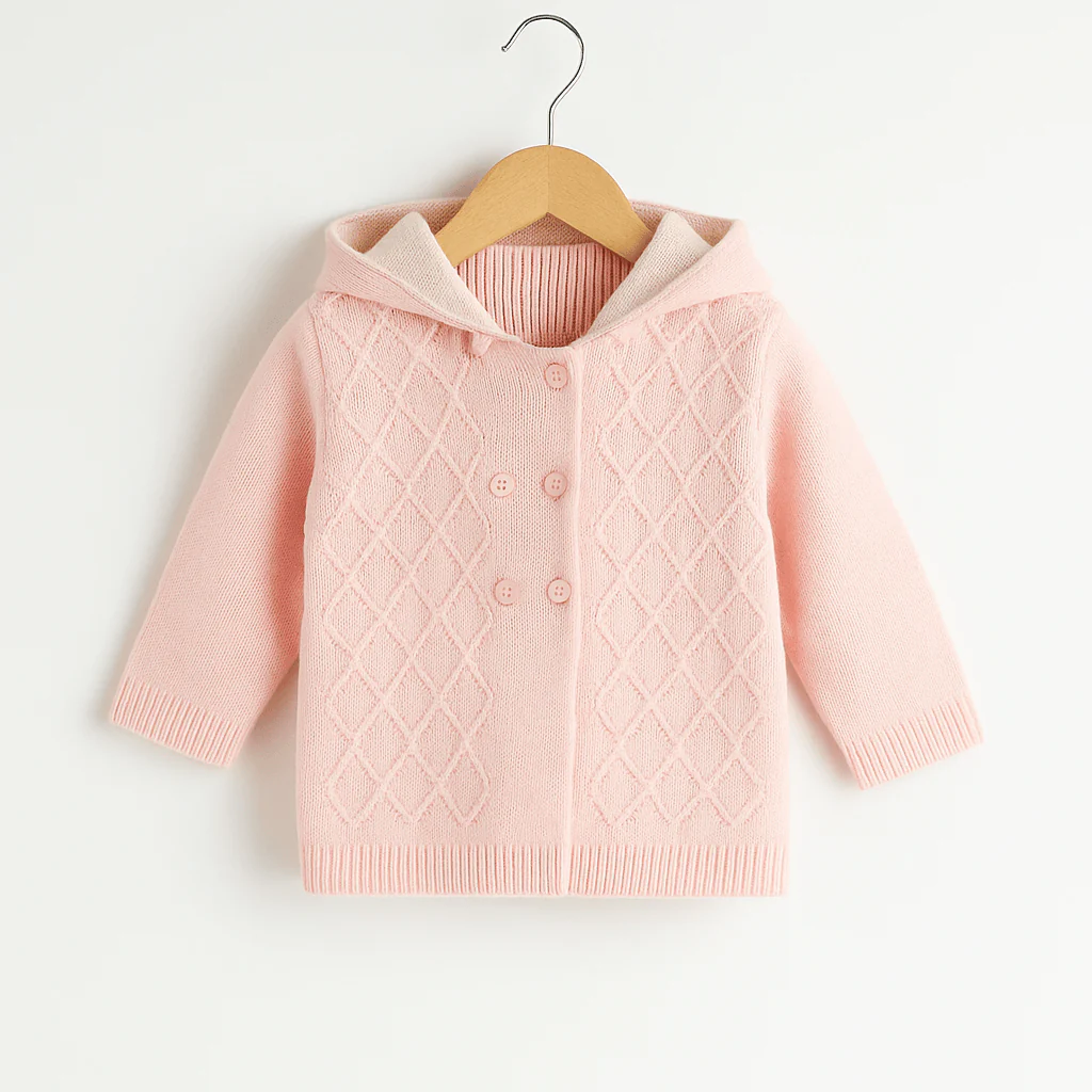 Giacca in maglia per neonata in un delicato rosa pastello, caratterizzata da un raffinato motivo intrecciato a rombi sul davanti. Il modello presenta cappuccio foderato, chiusura doppio petto con piccoli bottoni tono su tono e finiture a costine su polsini e fondo. Un capo morbido, elegante e confortevole, ideale per aggiungere un tocco di dolcezza ai look quotidiani.