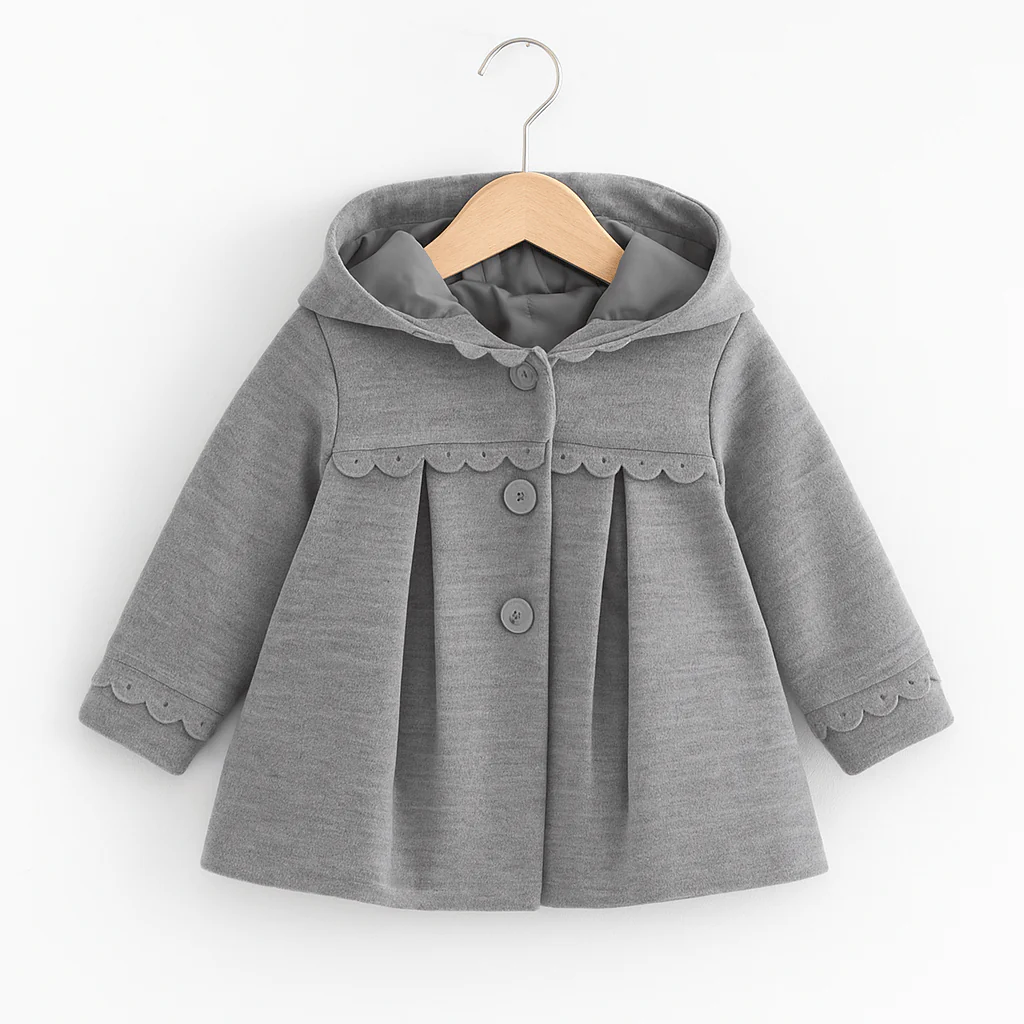 Cappottino grigio con cappuccio, dallo stile delicato e raffinato. Il design presenta una **linea morbida** con pieghe frontali che aggiungono volume e armonia. Il bordo del carrè e dei polsini è impreziosito da un elegante **dettaglio smerlato**, che dona un tocco romantico. Chiusura con bottoni tono su tono. Un modello perfetto per un look curato e dolce nelle giornate più fresche.
