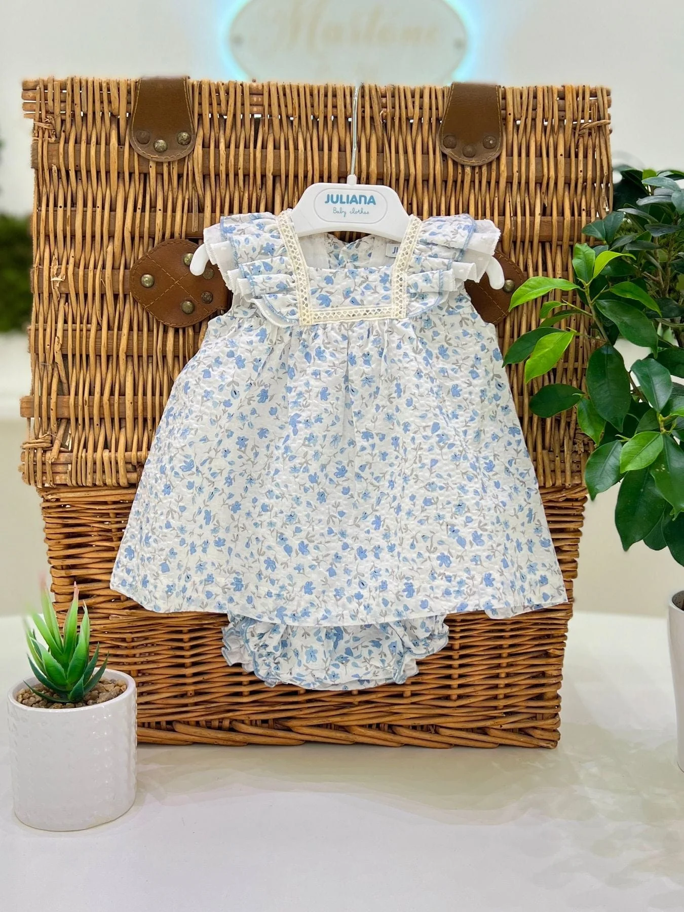 Completo due pezzi neonata con coulotte in misto lino. Manica a giro con rouches e fantasia floreale