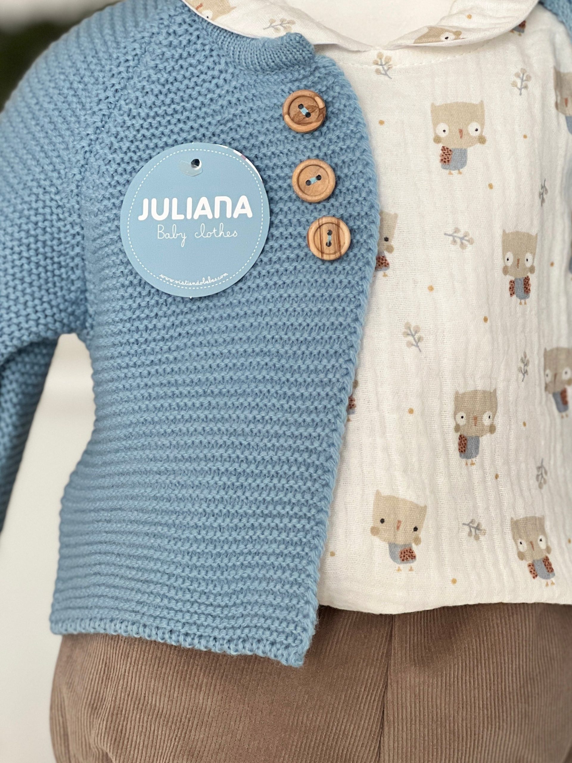 Completo bimbo tre pezzi nei toni del celeste. Il cardigan in lana sintetica, morbido e caldo, offre comfort e versatilità, con una trama che garantisce una buona protezione contro il freddo. La camicia, caratterizzata da una fantasia giocosa con gufetti disegnati, aggiunge un tocco di allegria e originalità al look, rendendo il completo sia elegante che divertente. Completa l’outfit il pantaloncino a coste, foderato all’interno in caldo cotone, che assicura una vestibilità comoda e una calda protezione. Questo completo unisce praticità e stile, perfetto per le giornate più fresche.