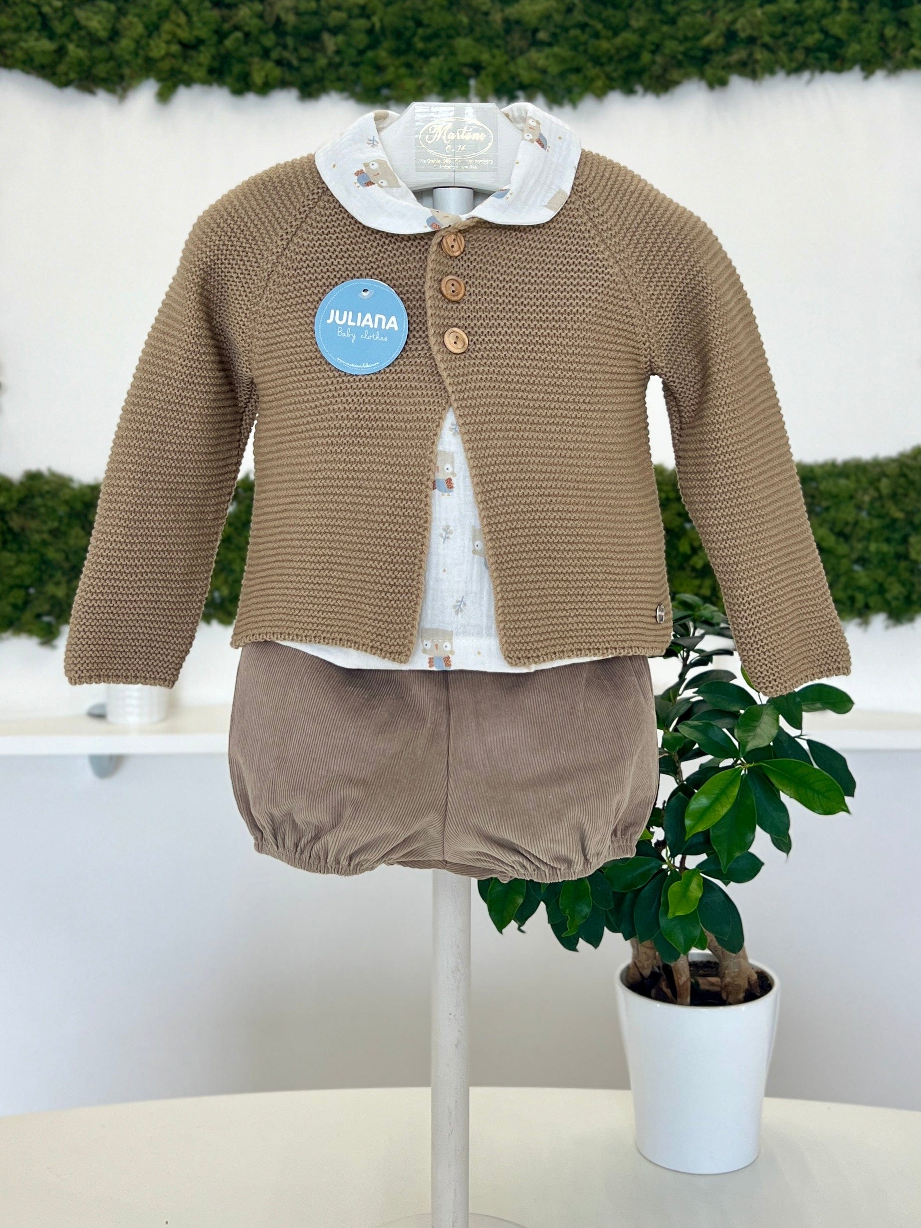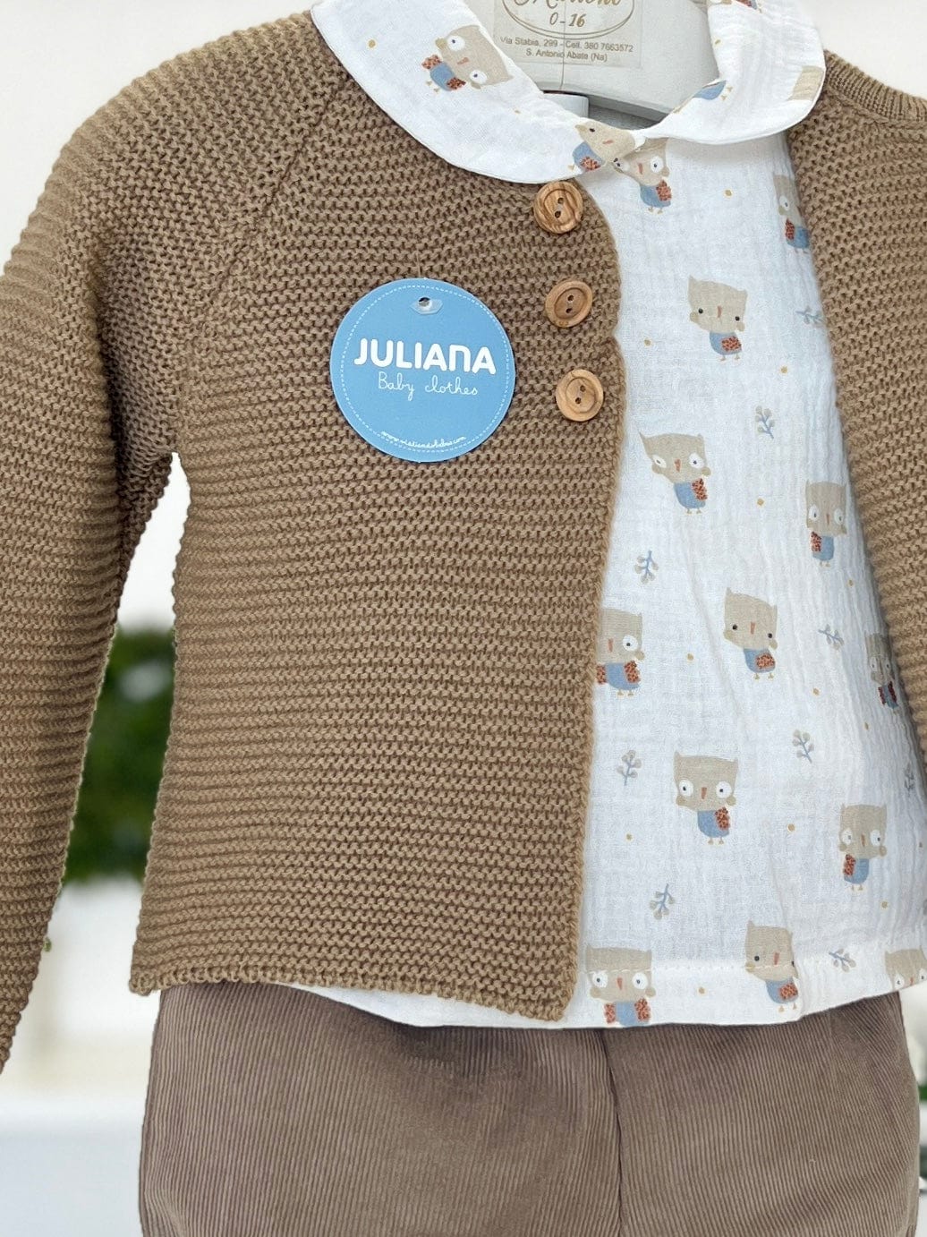 Completo bimbo tre pezzi nei toni del beige. Il cardigan in lana sintetica, morbido e caldo, offre comfort e versatilità, con una trama che garantisce una buona protezione contro il freddo. La camicia, caratterizzata da una fantasia giocosa con gufetti disegnati, aggiunge un tocco di allegria e originalità al look, rendendo il completo sia elegante che divertente. Completa l’outfit il pantaloncino a coste, foderato all’interno in caldo cotone, che assicura una vestibilità comoda e una calda protezione. Questo completo unisce praticità e stile, perfetto per le giornate più fresche.