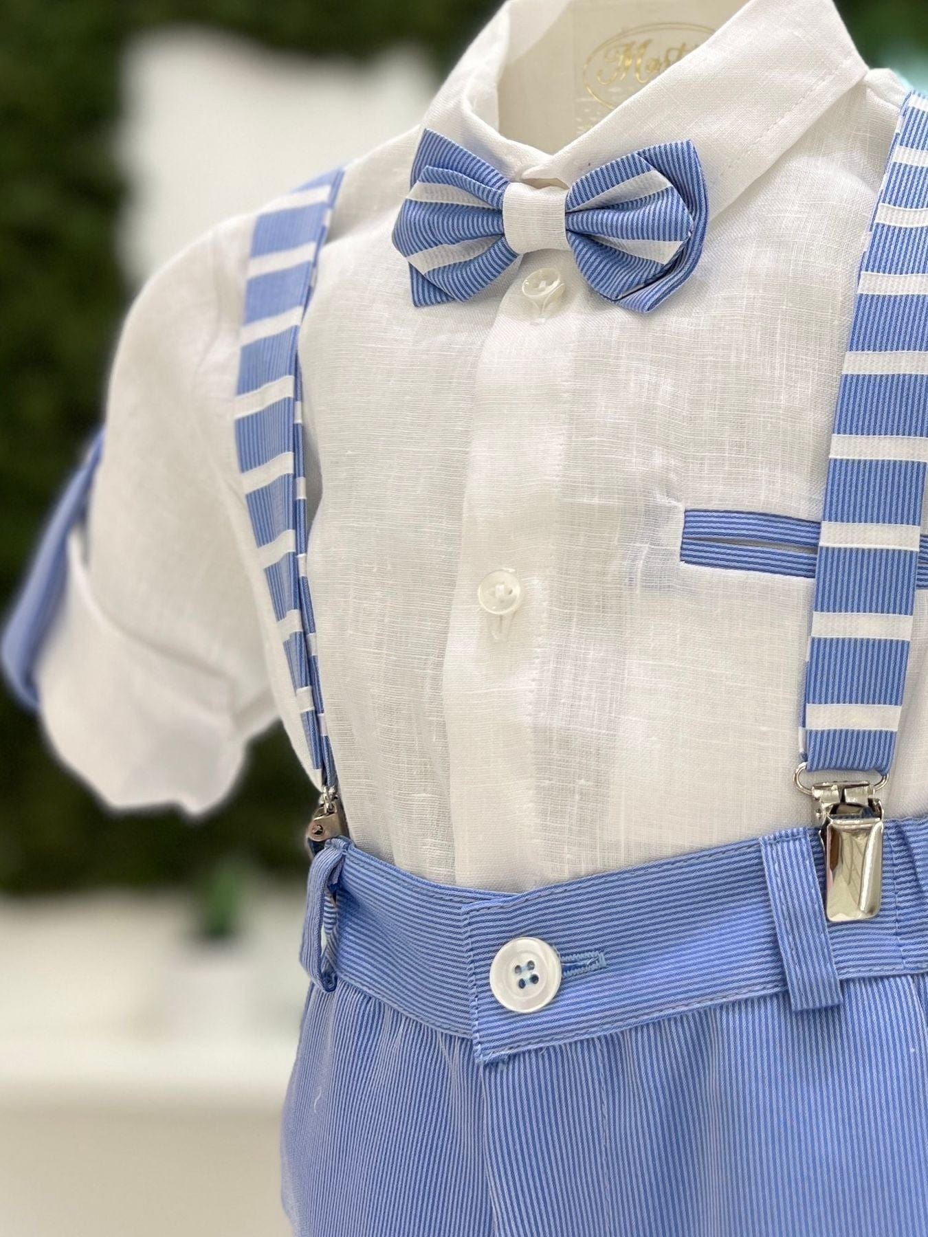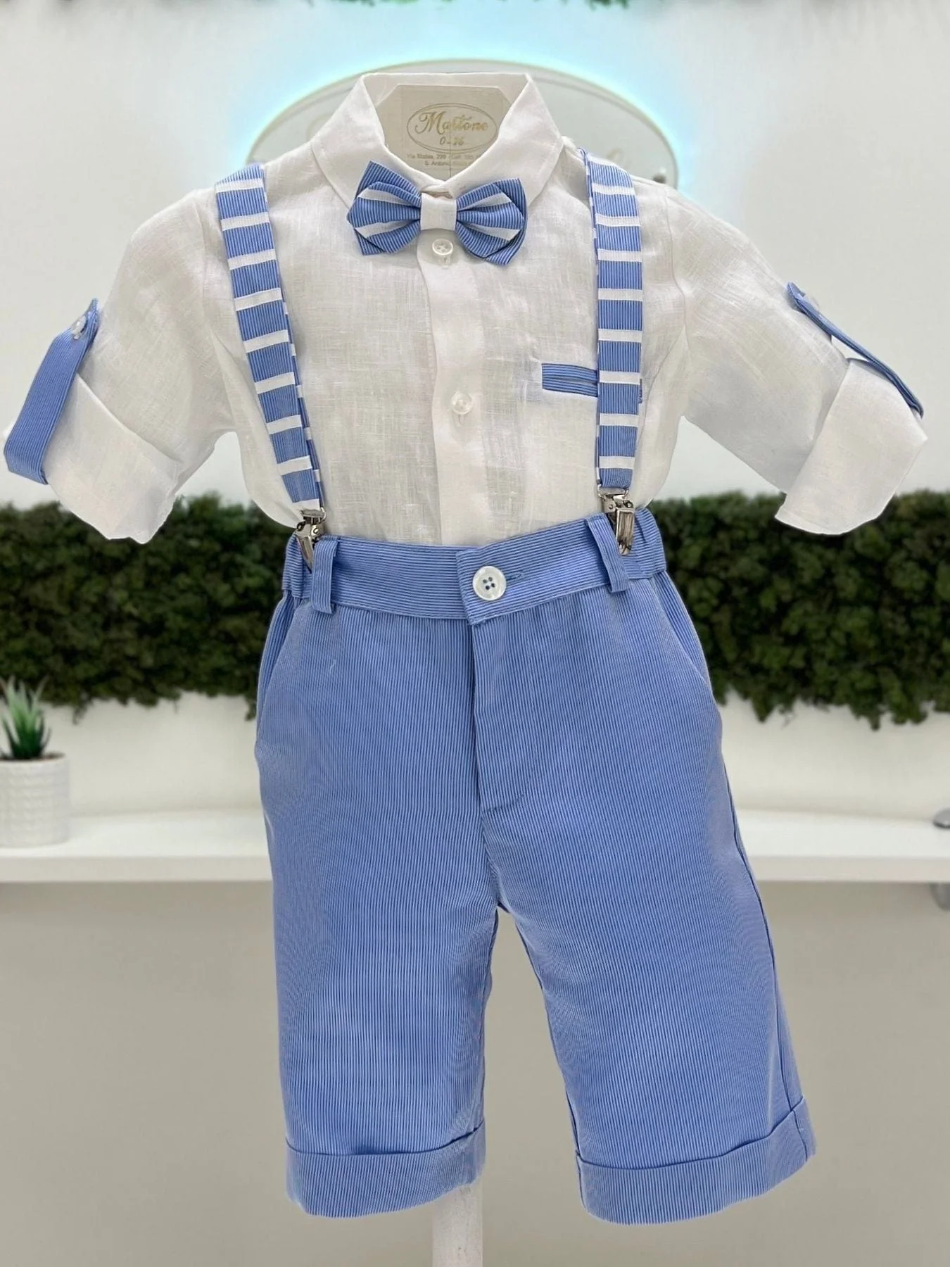 Completo bimbo composto da pantalone in cotone operato e camicia in lino con manica con risvolto e finta tasca a contrasto, bretelle e papillon.
