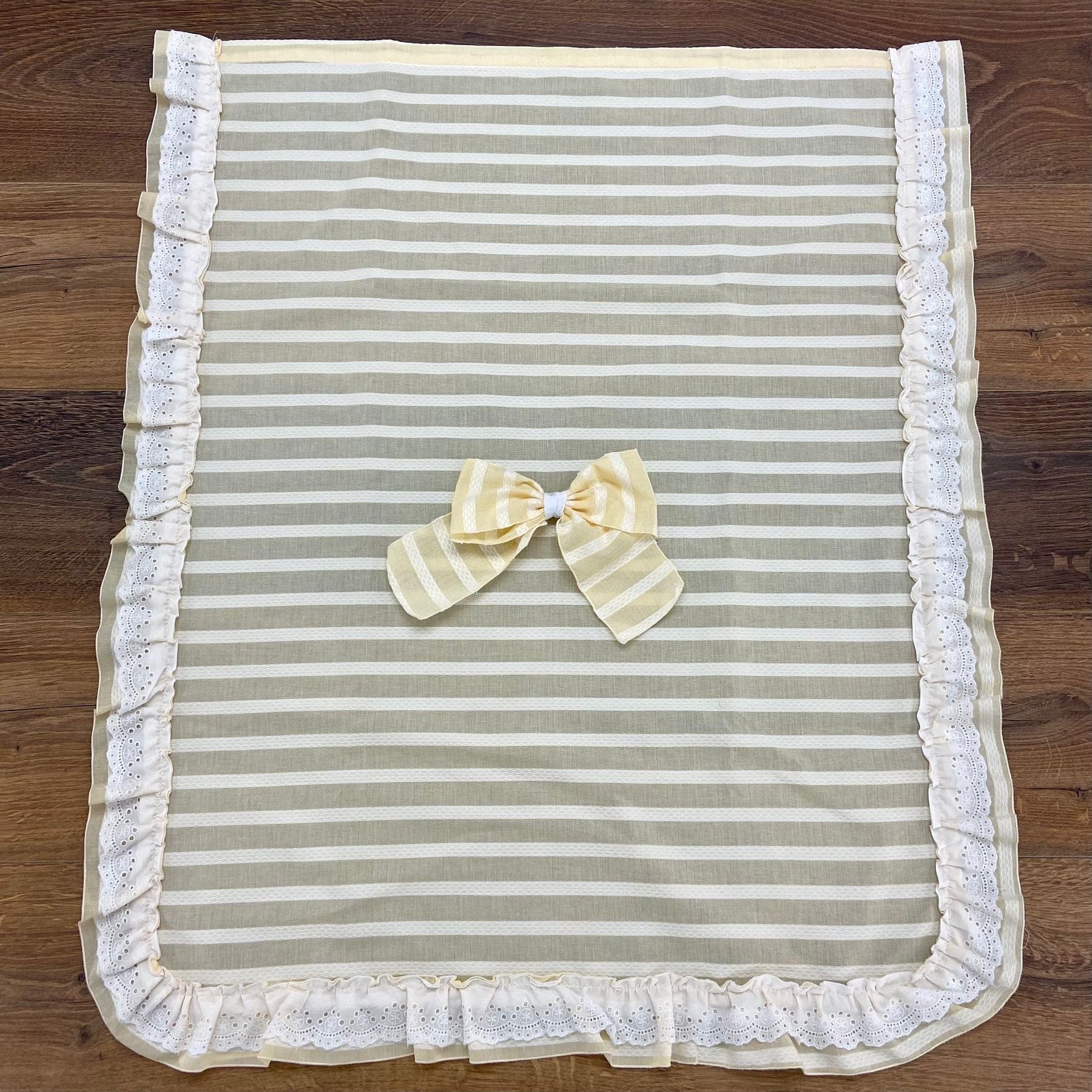 Copertina con bordatura con arriccio e pizzo san gallo.Applicazione con fiocco removibile.