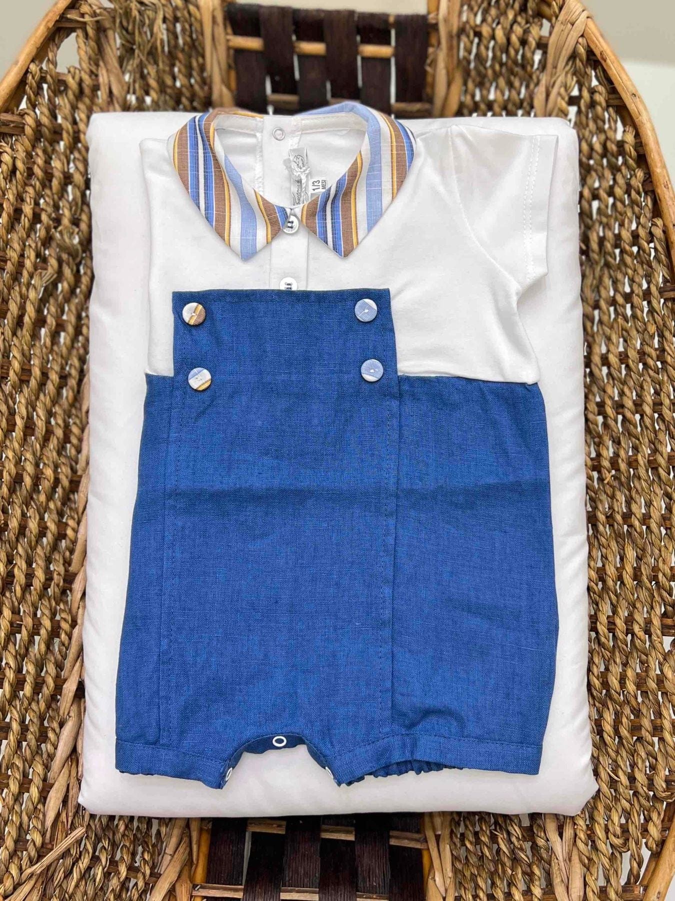 Pagliaccetto neonato in cotone e lino con trama a righe.