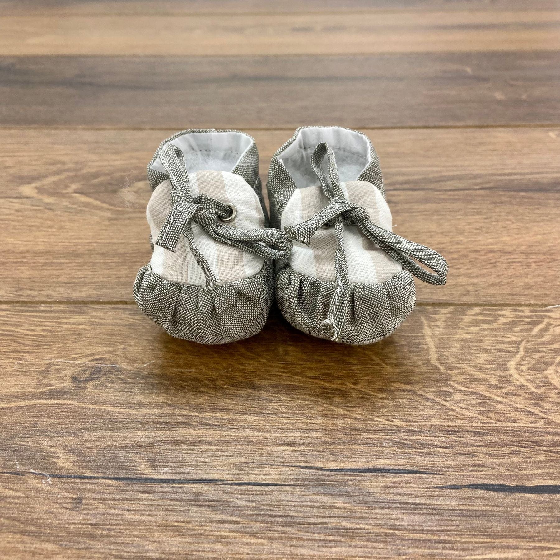 Scarpetta nascita in lino con dettagli a righe.