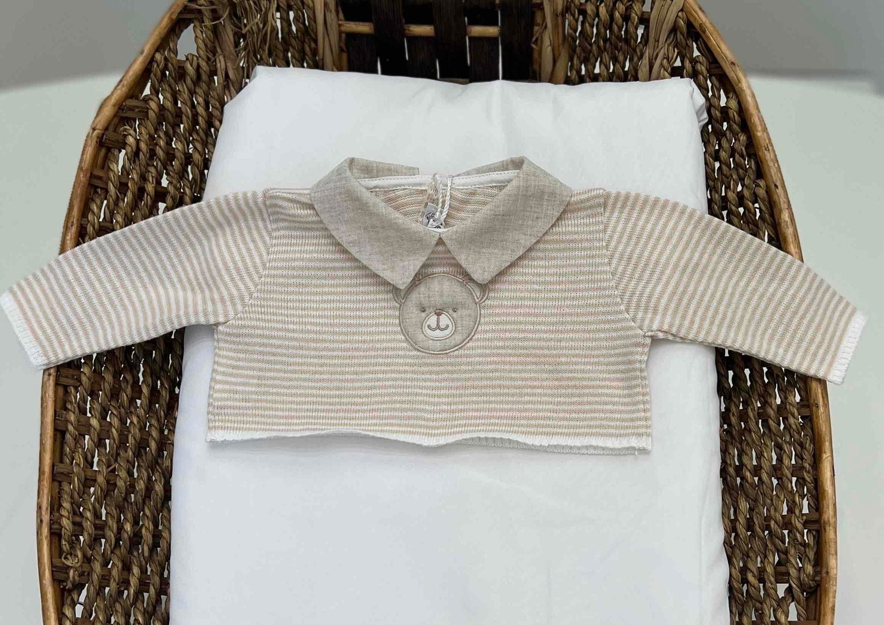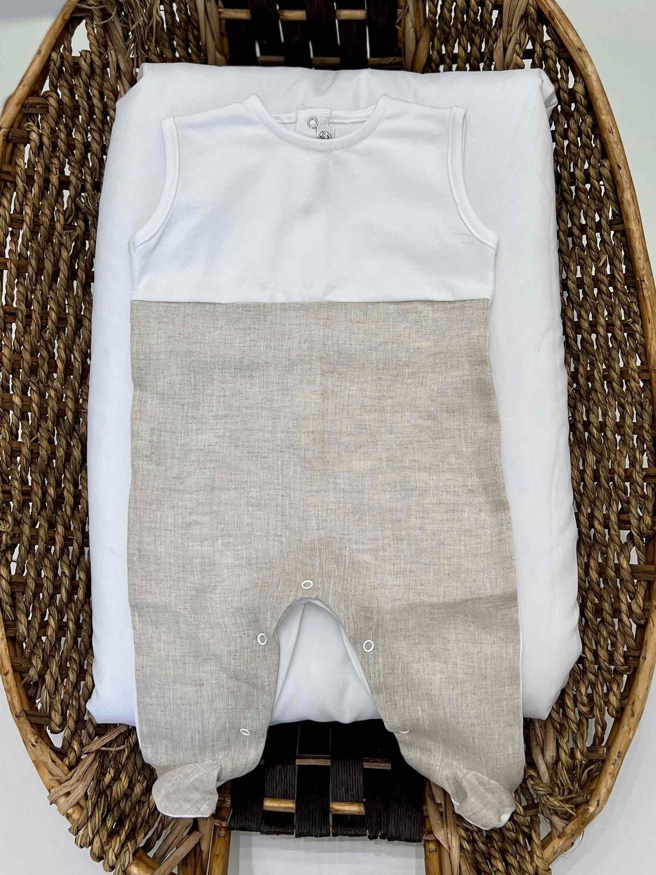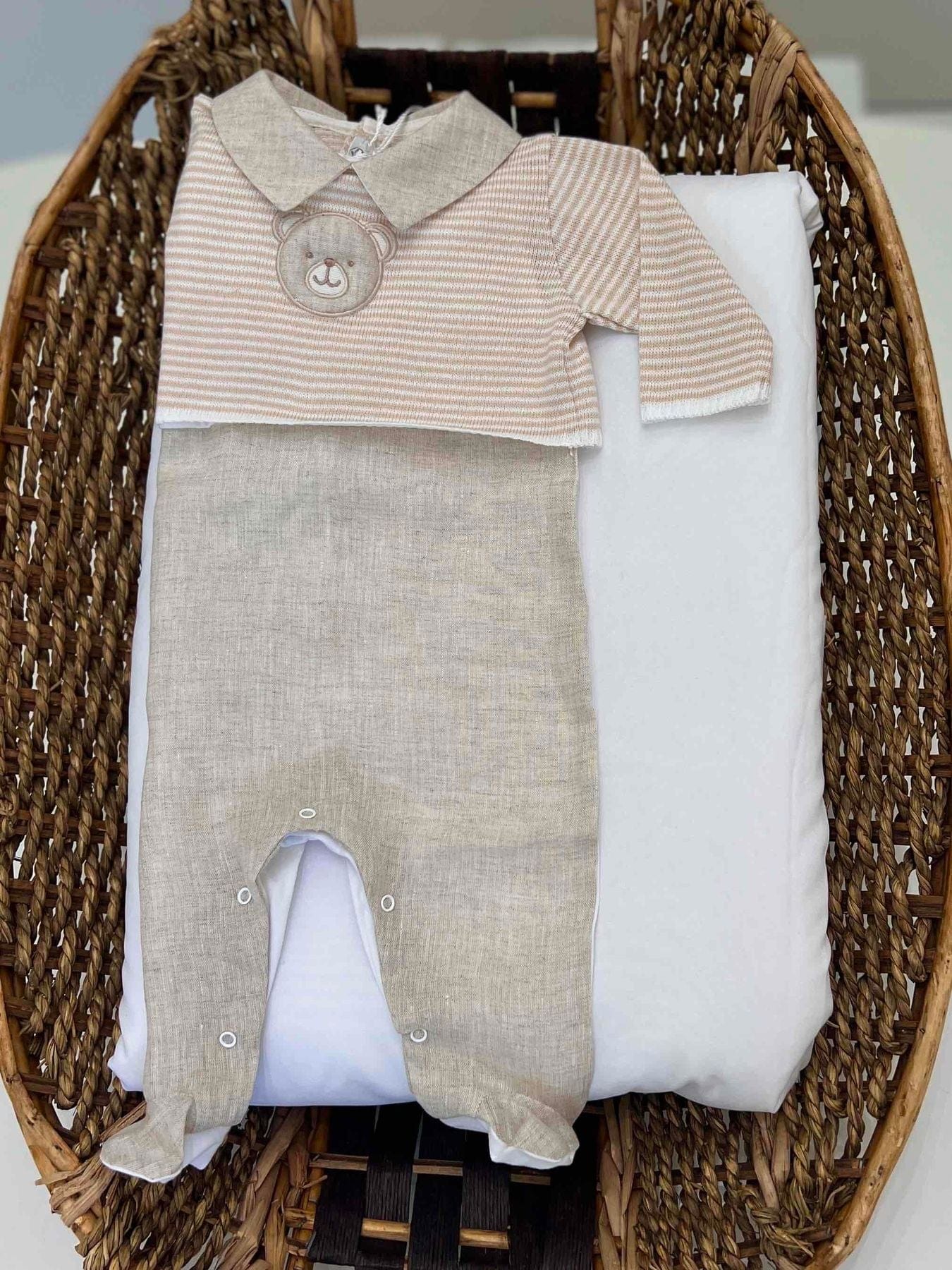 Tutina neonato intera con manica staccabile a righe in cotone e lino con sopra maglietta crop in cotone a righe.