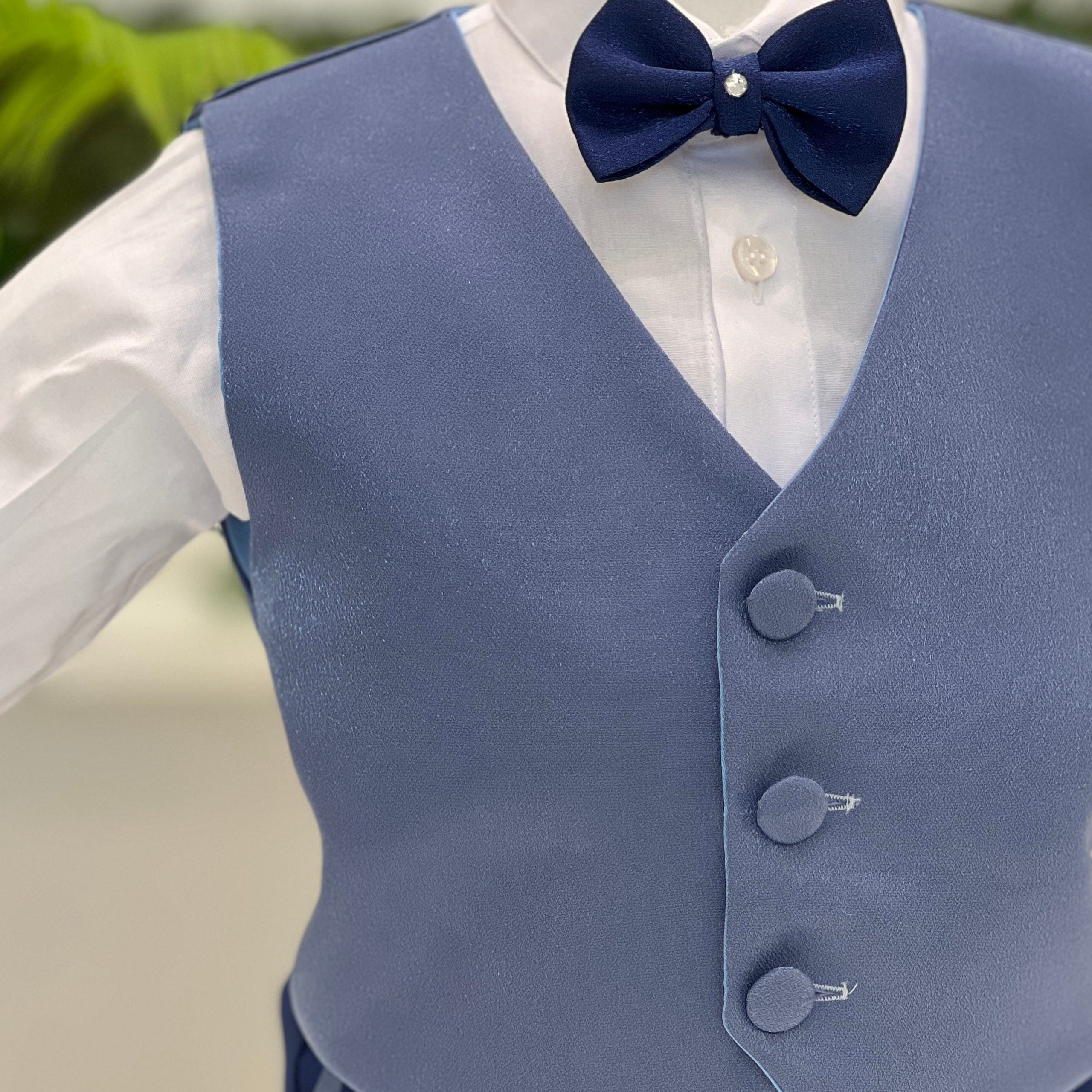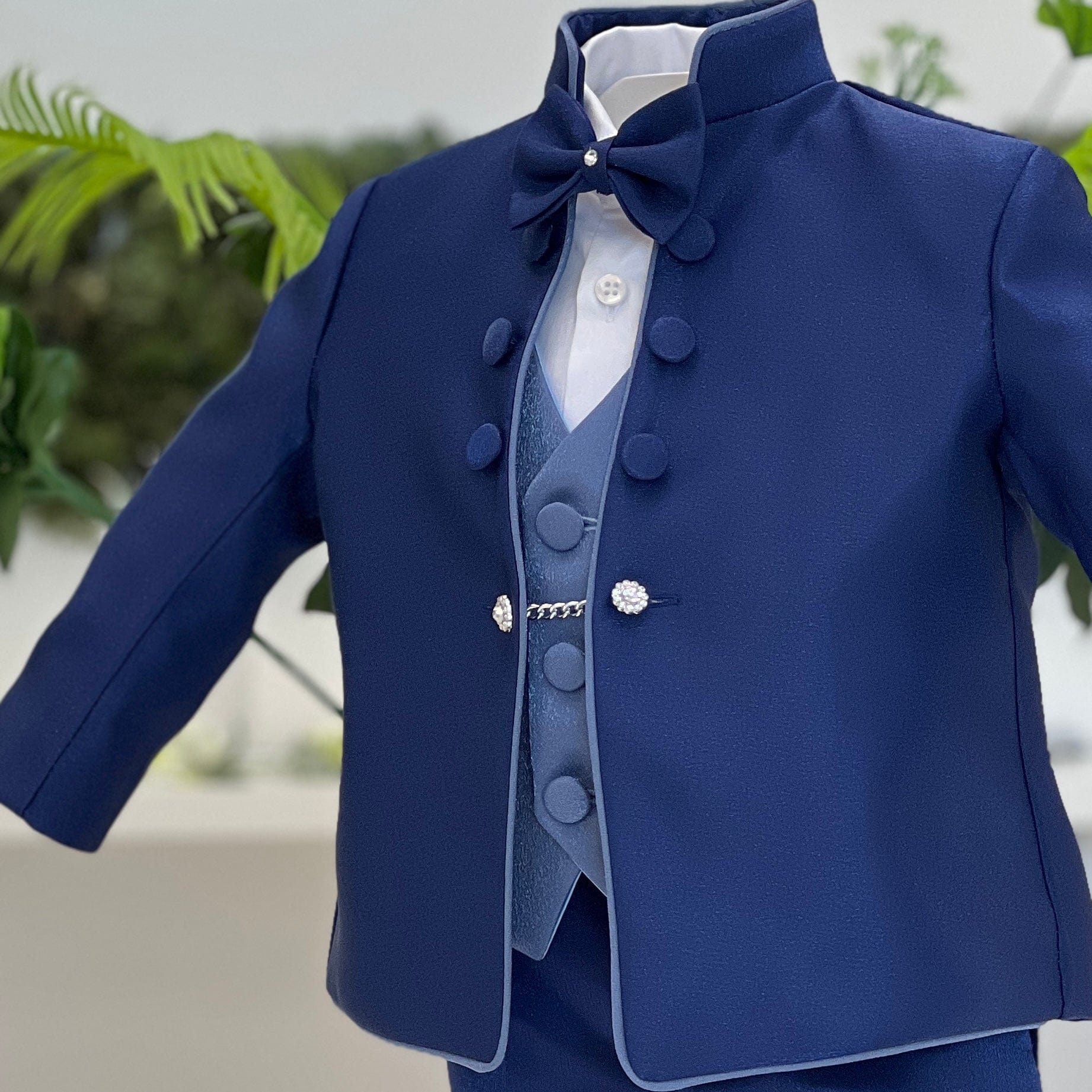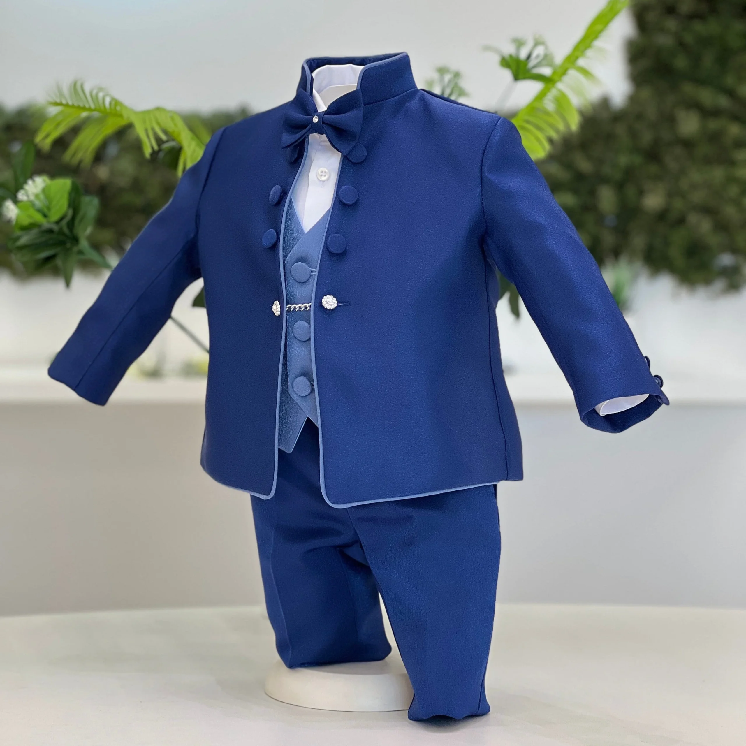 Abito battesimale sartoriale in tonalità blu notte, realizzato con una cura impeccabile per ogni dettaglio. La giacca con collo alla coreana e bottoni rivestiti esalta l’eleganza del completo, mentre il gilet in tessuto cangiante con catena decorativa aggiunge un tocco di raffinatezza. Il papillon coordinato completa un insieme dal carattere deciso e sofisticato, pensato per le cerimonie più esclusive. Un capo interamente sartoriale, sinonimo di stile, precisione e artigianalità italiana.
