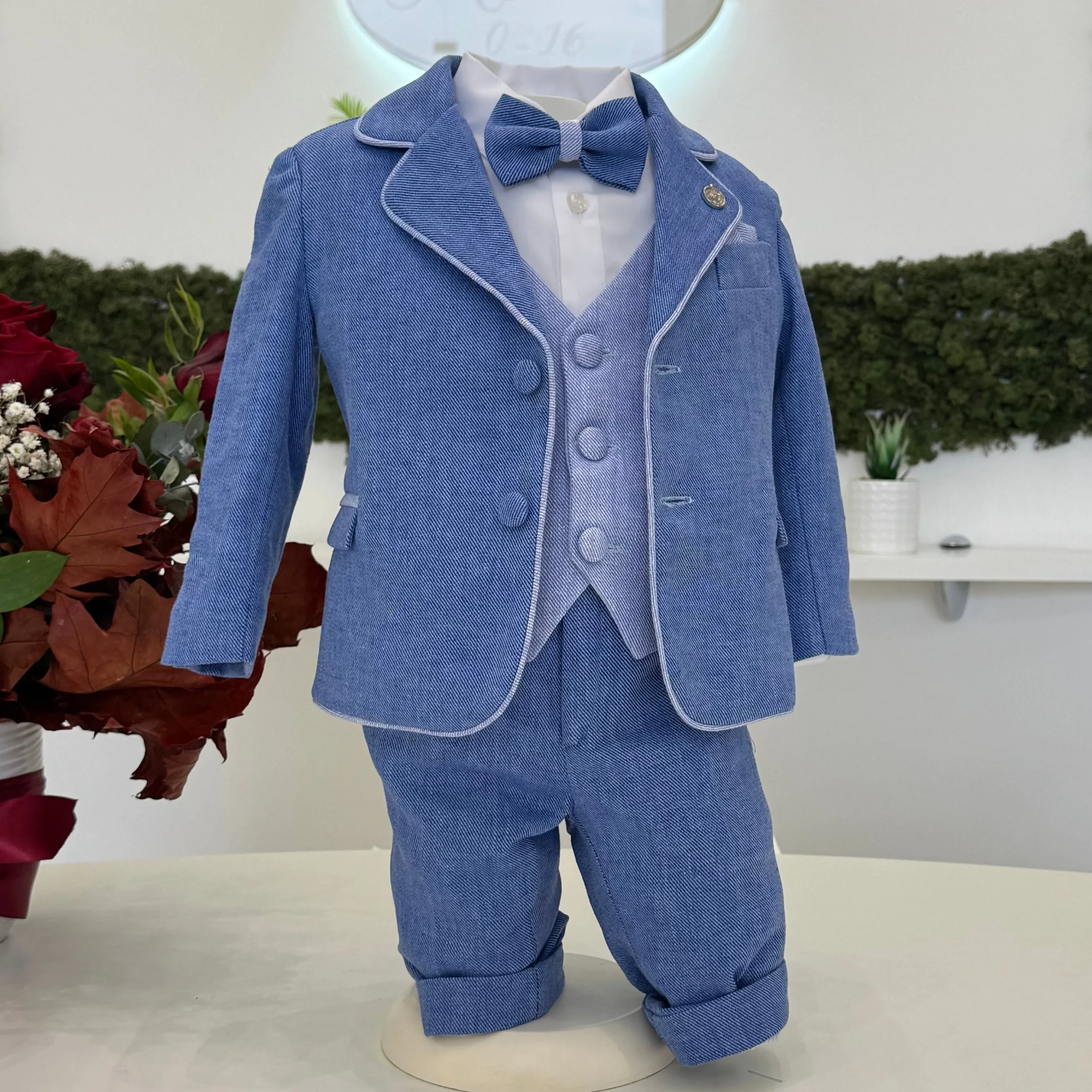 Un completo dallo stile moderno e raffinato, interamente realizzato con cura sartoriale. La giacca effetto denim, impreziosita da profili a contrasto e bottoni rivestiti, si abbina al gilet e al papillon coordinati per un look elegante ma contemporaneo. La camicia bianca completa l’ensemble con un tocco classico, mentre il pantalone con risvolto garantisce una vestibilità impeccabile. Un abito perfetto per il battesimo o per ogni cerimonia che richiede un’eleganza distintiva.