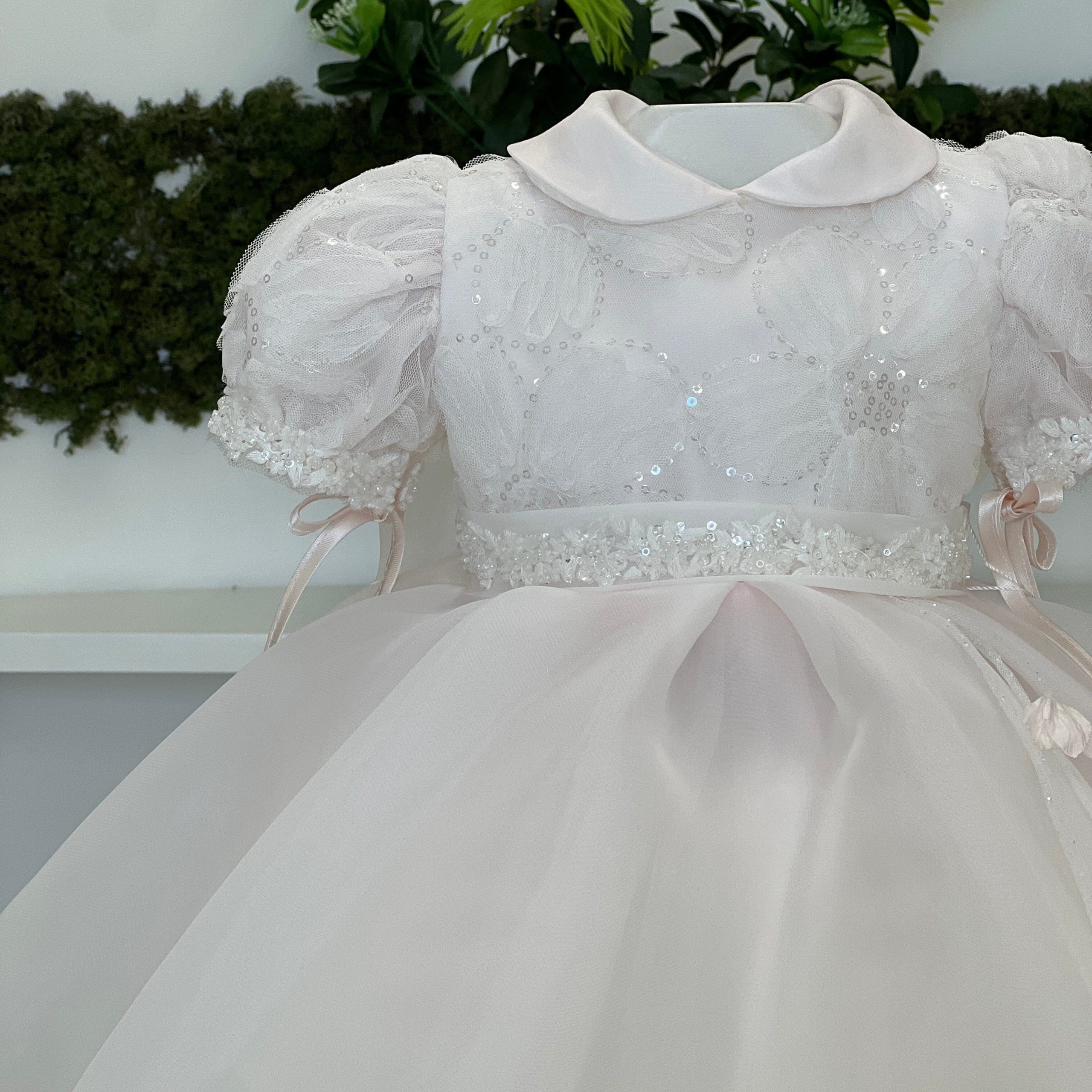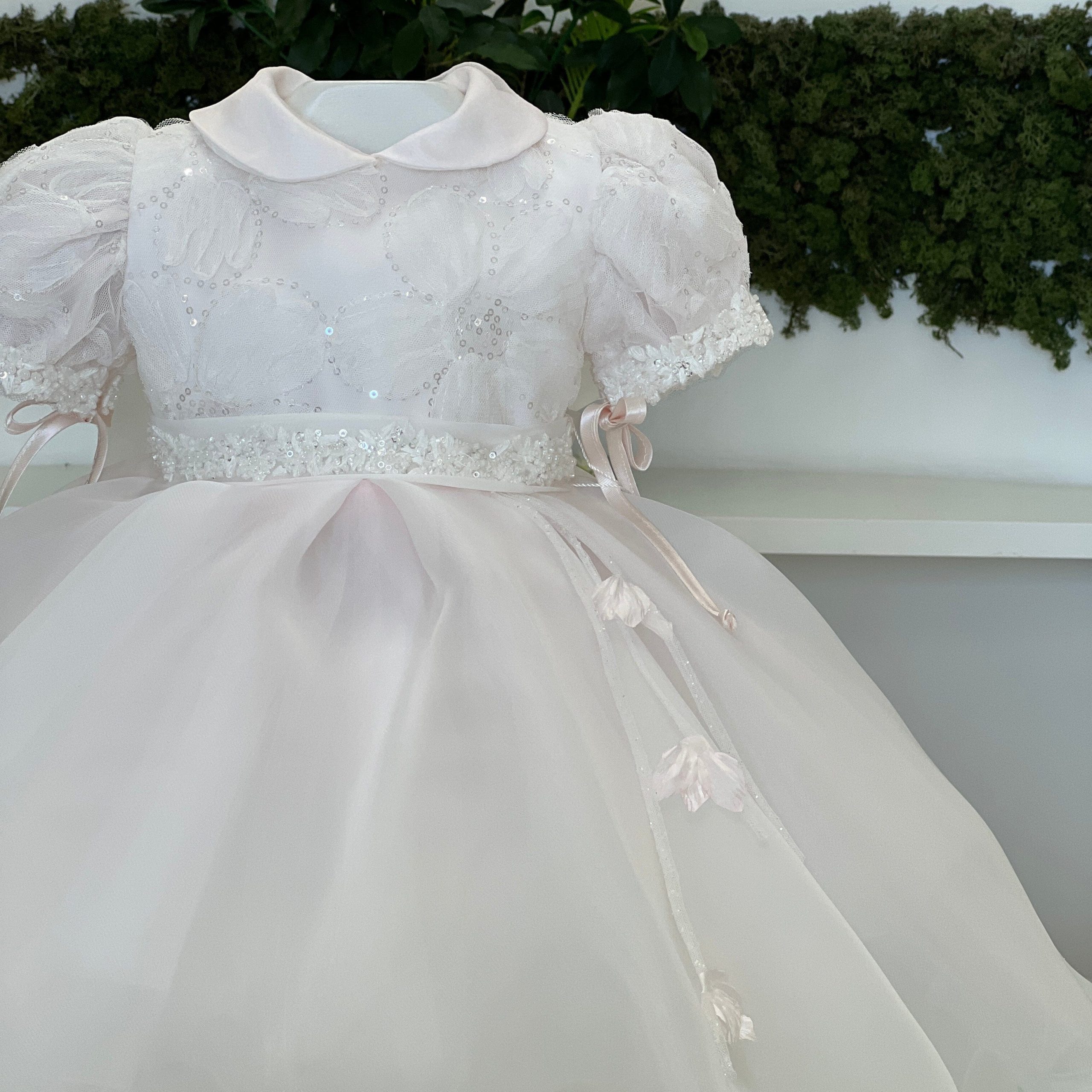 Luxury Dress Mavi – Abito battesimale rosa in organza con corpino ricamato a motivi floreali e impreziosito da delicate paillettes. Le maniche a sbuffo sono rifinite con nastrini in raso, mentre la gonna ampia e vaporosa, con bordo ondulato e più strati, è arricchita da un grande fiocco sul retro. Inclusi manicotti coordinati e culotte copripannolino.