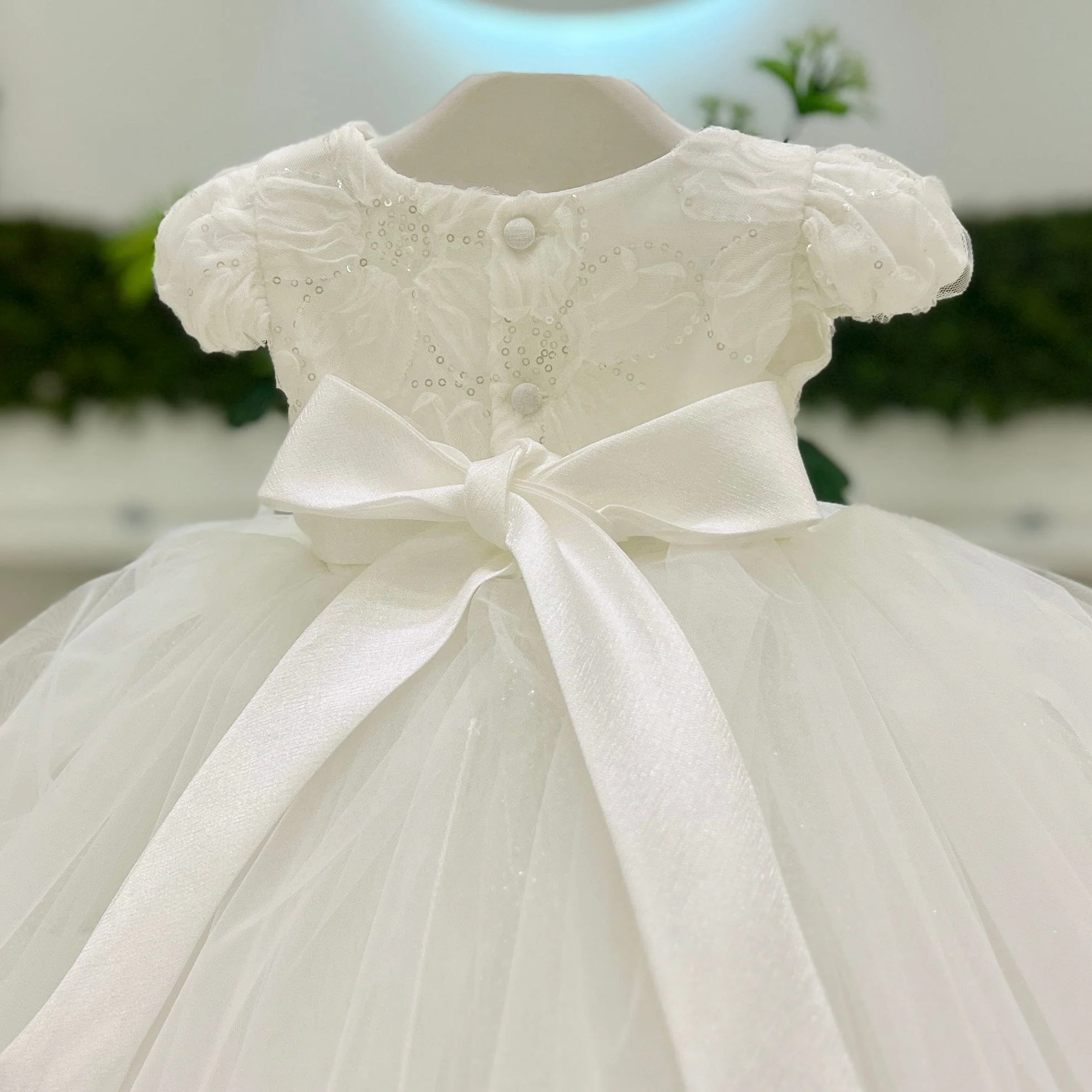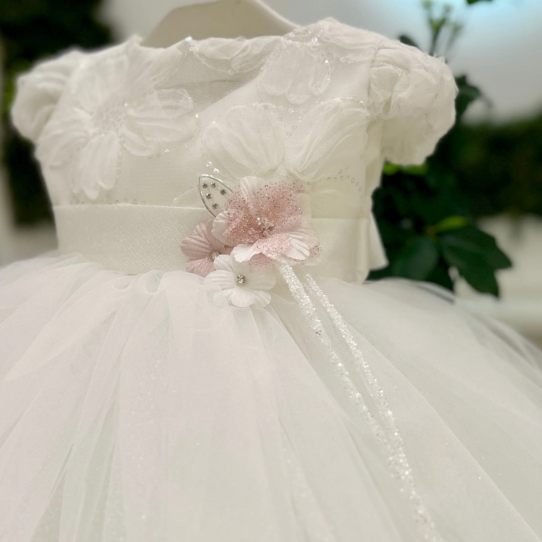 Un abito battesimale che unisce eleganza e cura dei dettagli. Il doppio strato di tulle, semplice e ricamato, crea un effetto leggero e raffinato, perfetto per un’occasione speciale. Il corpino è impreziosito da applique floreali in tulle ricamato e paillettes, che donano luminosità con delicatezza. La cintura in lurex bianco, con fiocco sul retro, esalta la linea con raffinatezza, mentre l’applicazione floreale rosata con punti luce aggiunge un dettaglio sofisticato. Un equilibrio perfetto tra tradizione e modernità, ideale per un battesimo da ricordare.