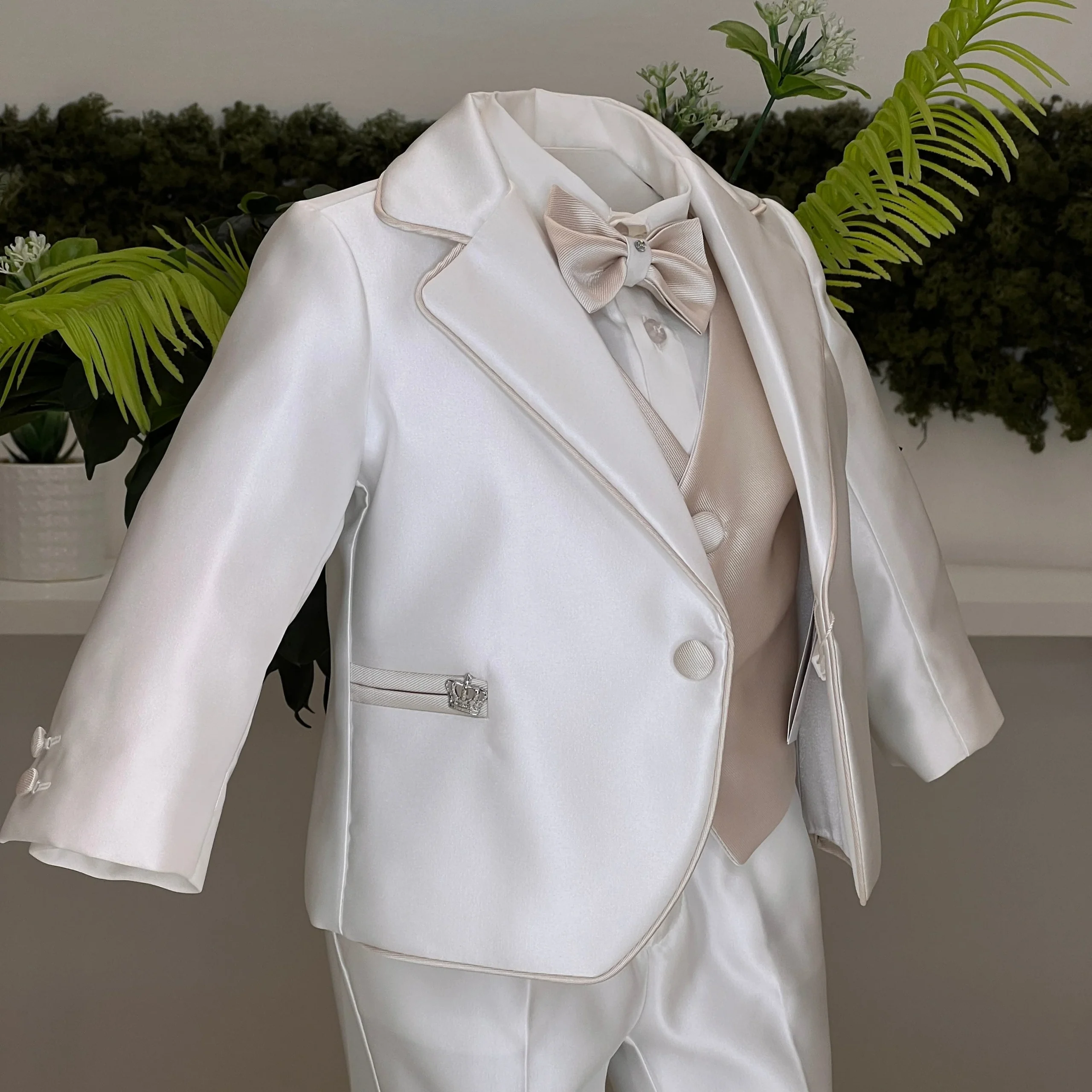 Abito da battesimo in mikado avorio, composto da giacca sartoriale con bottoni rivestiti e profili tono su tono, gilet con chiusura a tre bottoni, camicia con papillon coordinato e pantalone dal taglio classico. Il taschino della giacca è impreziosito da un dettaglio gioiello, per un insieme elegante e raffinato.