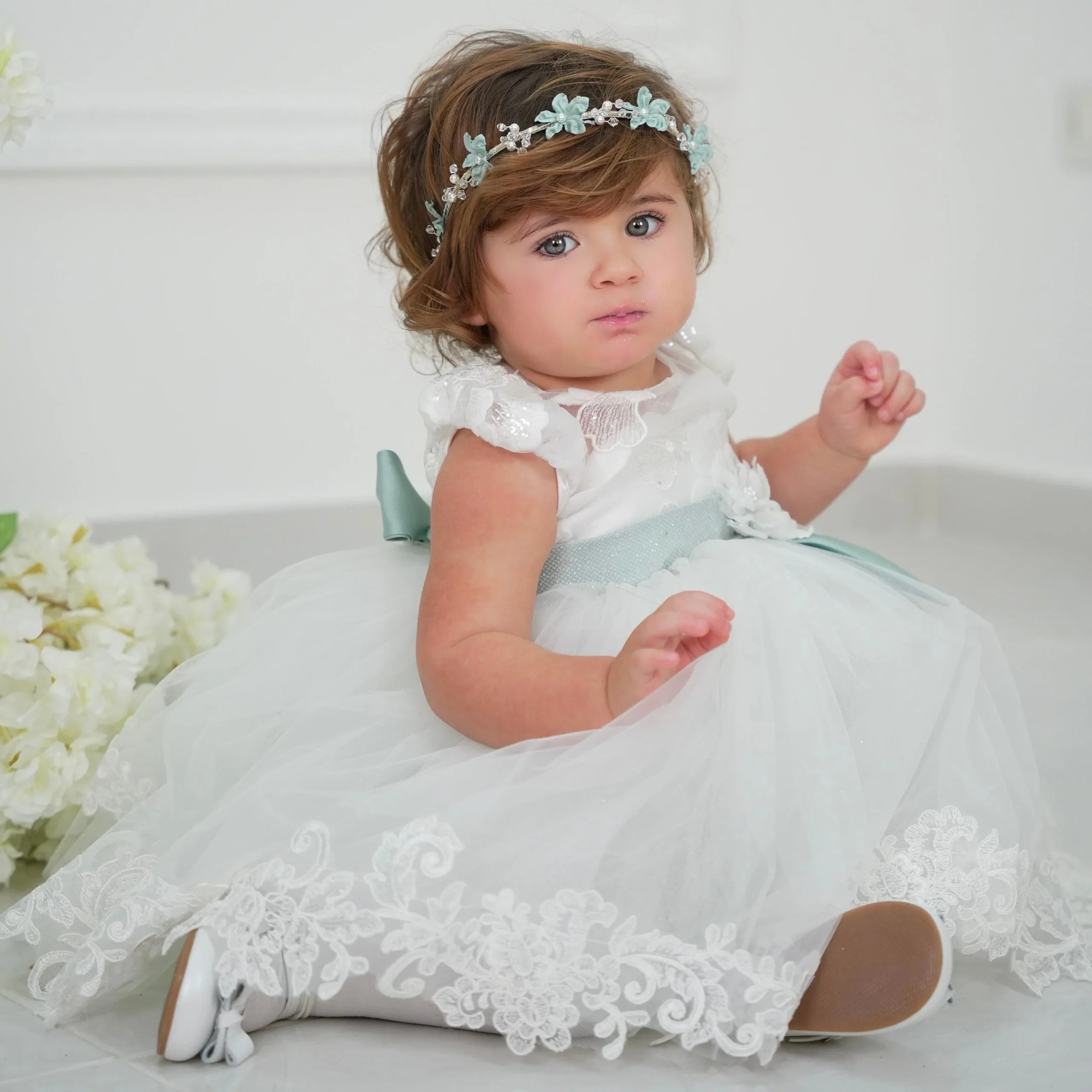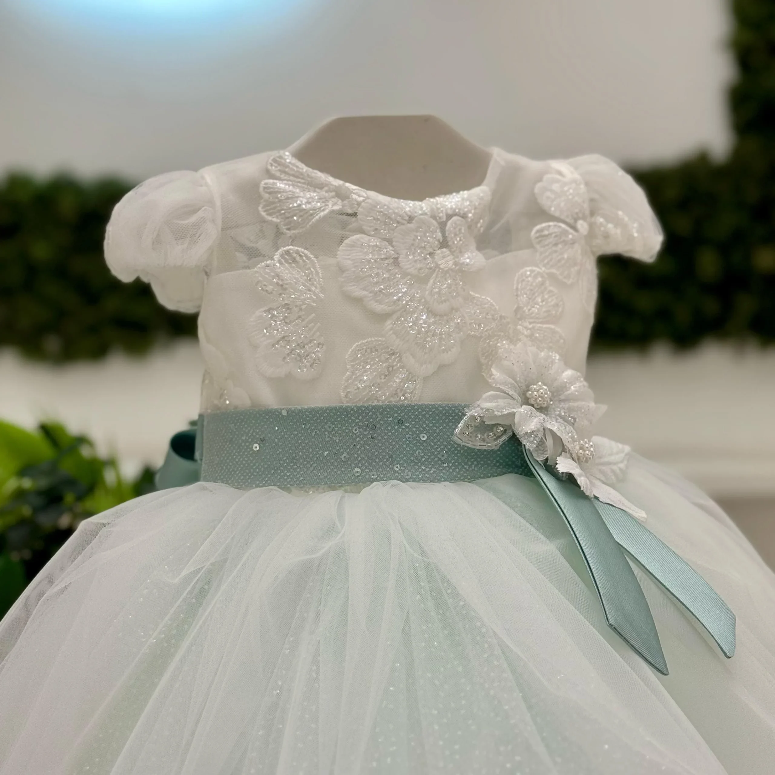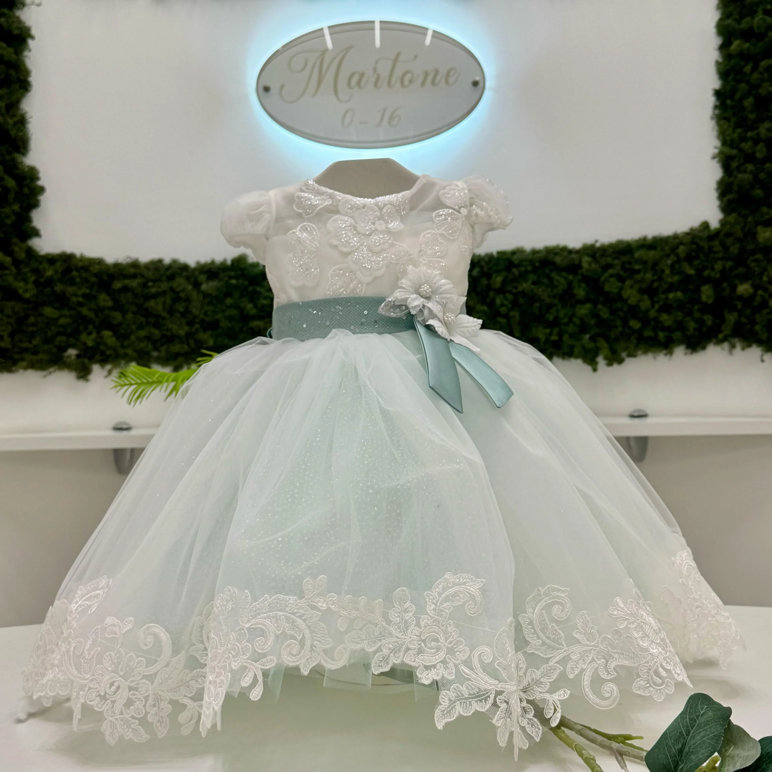 Abito battesimale dal colore verde fresco e moderno, che dona un tocco di novità e freschezza all’occasione. La gonna in tulle classico e glitterato è impreziosita da un elegante bordo in pizzo ramage, che arricchisce il movimento della stoffa. Il corpino bianco, con maniche ad aletta, è decorato con ramage floreali e punti luce, che catturano la luce con delicatezza. La cintura in lurex verde, che richiama il tono del fondo della gonna, è completata da un elegante dettaglio floreale, conferendo all’abito un aspetto raffinato e contemporaneo. Un look innovativo e raffinato, perfetto per celebrare il battesimo con stile.